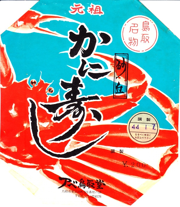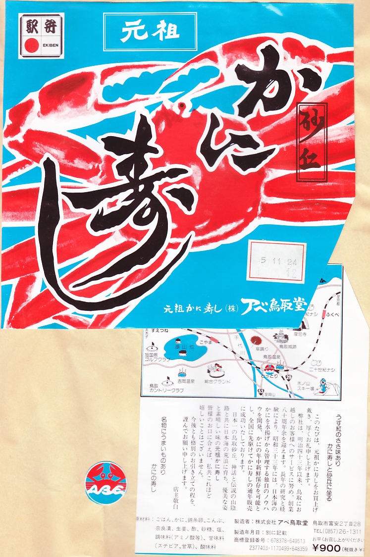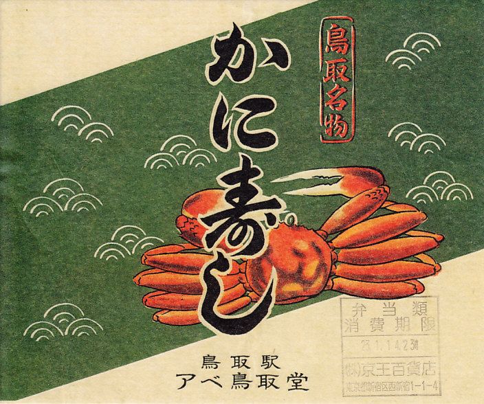 1969(昭和44)年1月7日の調製と思われる、昔の鳥取駅弁の掛紙。「元祖かに寿し」の絵柄は、当時も今も変わらない。