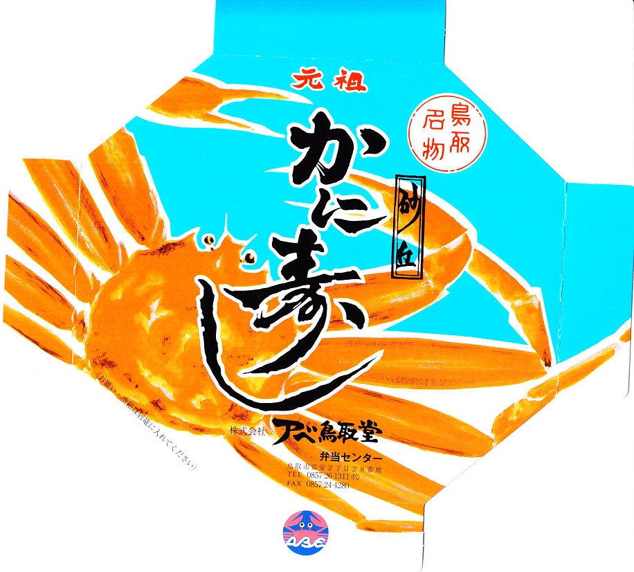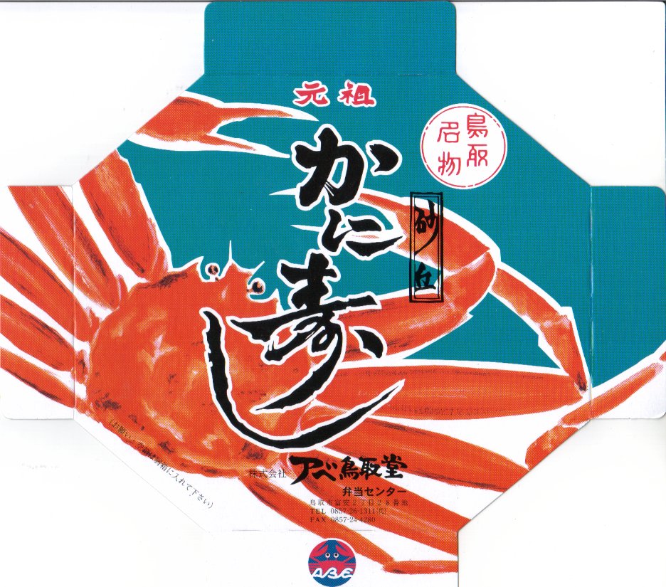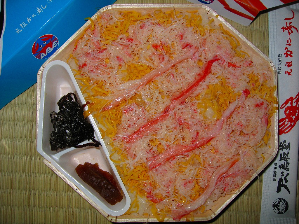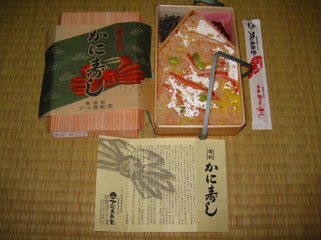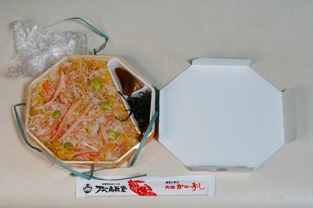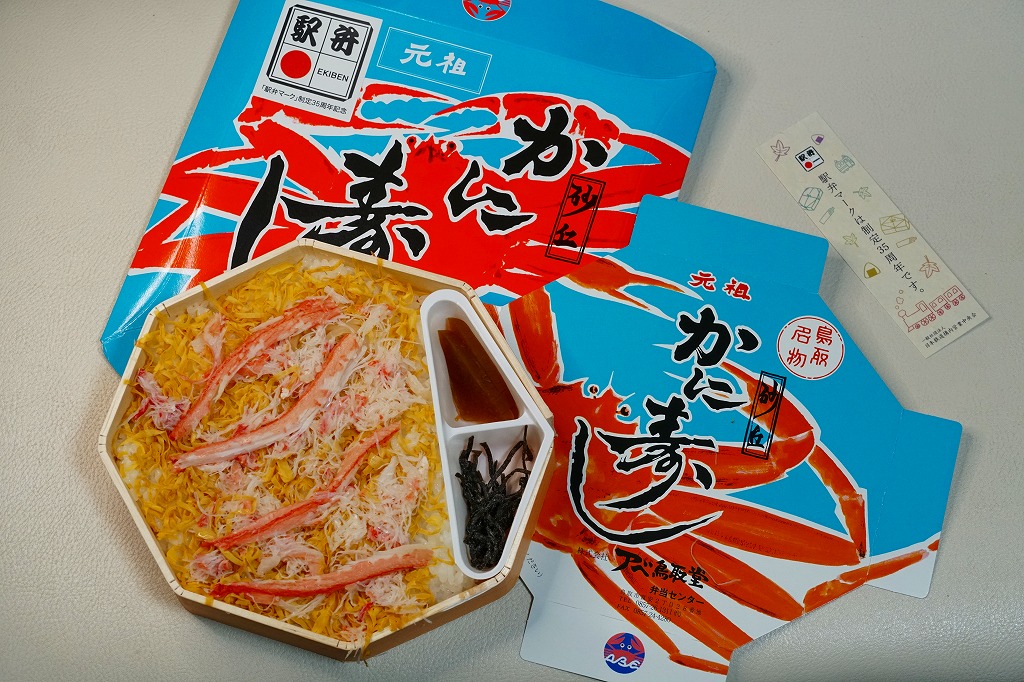 1952(昭和27)年11月に鳥取駅で発売された、カニ寿司の駅弁。1958(昭和33)年に保存技術の開発で一年中カニ駅弁を売るようになったのは、この鳥取駅弁が元祖である。カニを描いたボール紙のパッケージに、またカニを描いたふたをかける八角形の容器が入る。因幡米の酢飯を覆い隠すように、カニのほぐし身とカニ足が、錦糸卵とともに敷き詰められている。