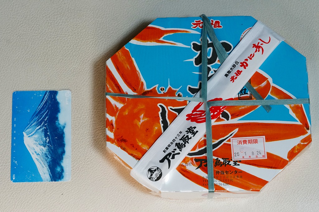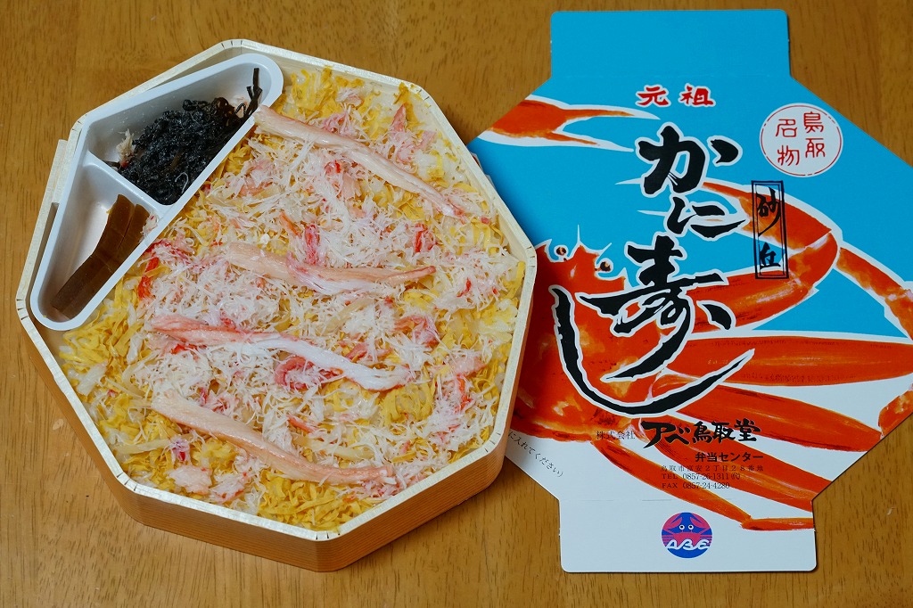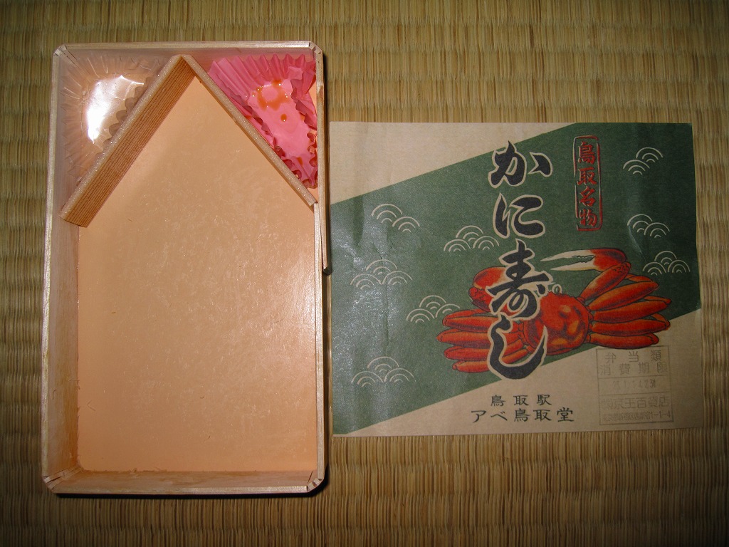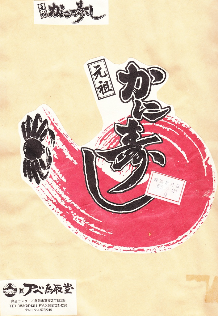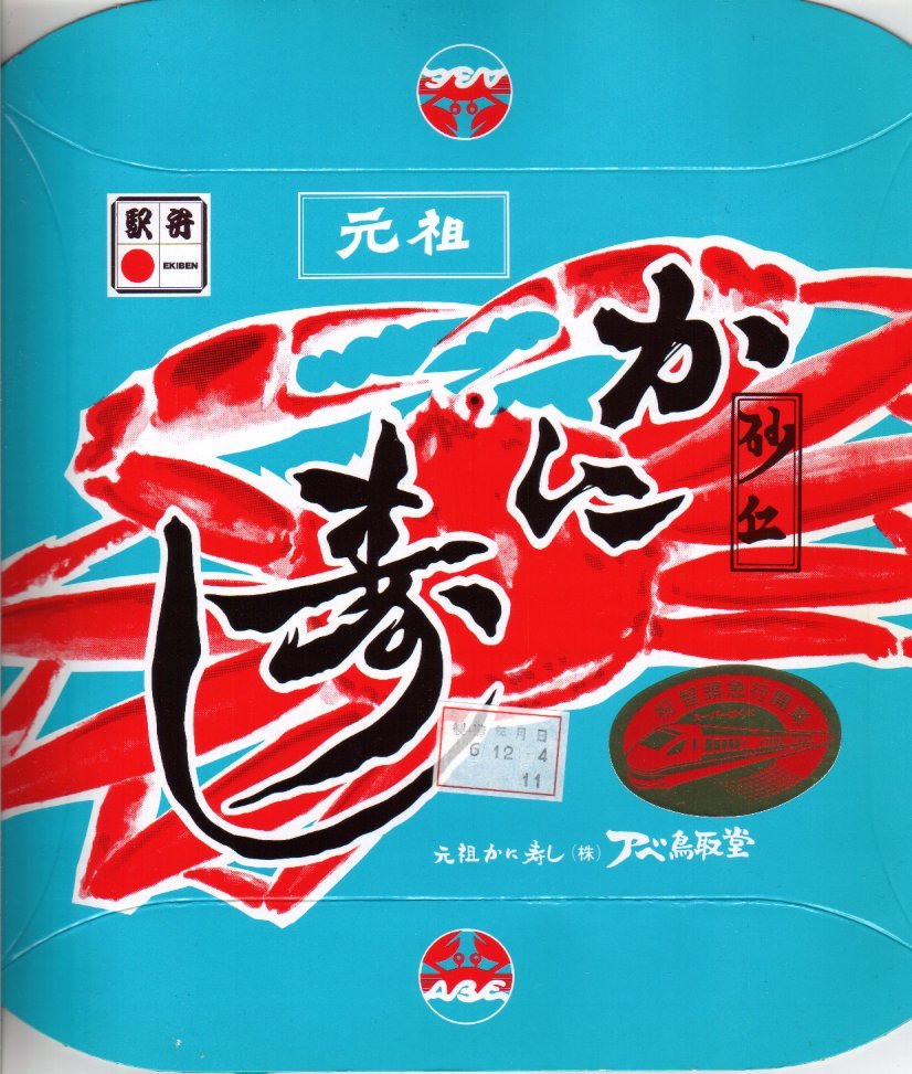 1952(昭和27)年11月に鳥取駅で発売された、カニ寿司の駅弁。1958(昭和33)年に保存技術の開発で一年中カニ駅弁を売るようになったのは、この鳥取駅弁が元祖である。カニを描いたボール紙のパッケージに、またカニを描いたふたをかける八角形の容器が入る。因幡米の酢飯を覆い隠すように、カニのほぐし身とカニ足が、錦糸卵とともに敷き詰められている。