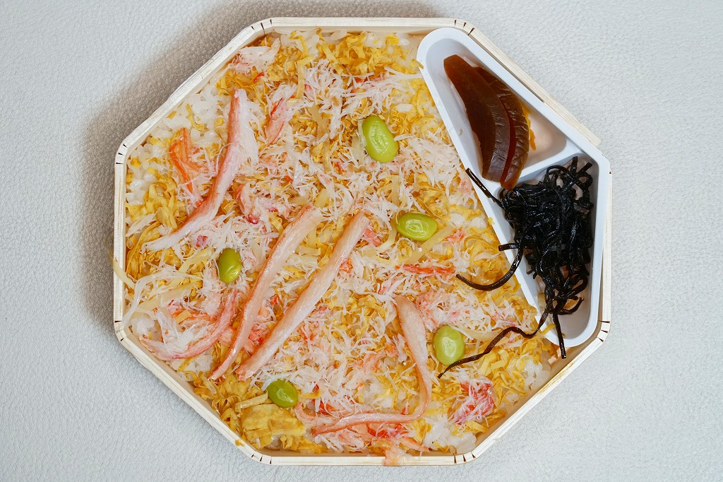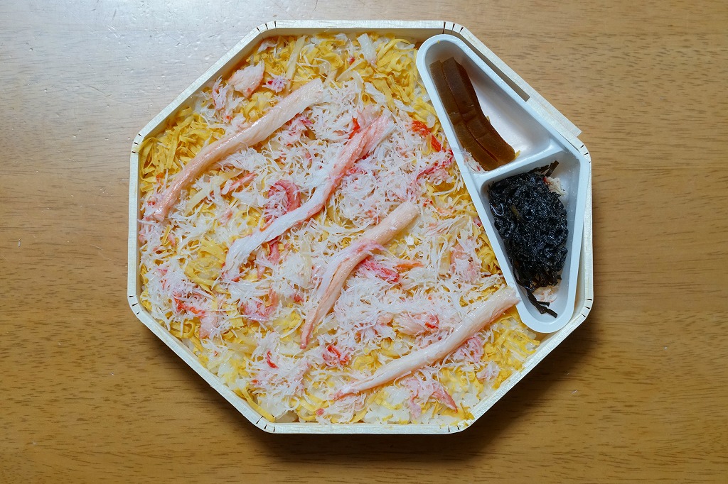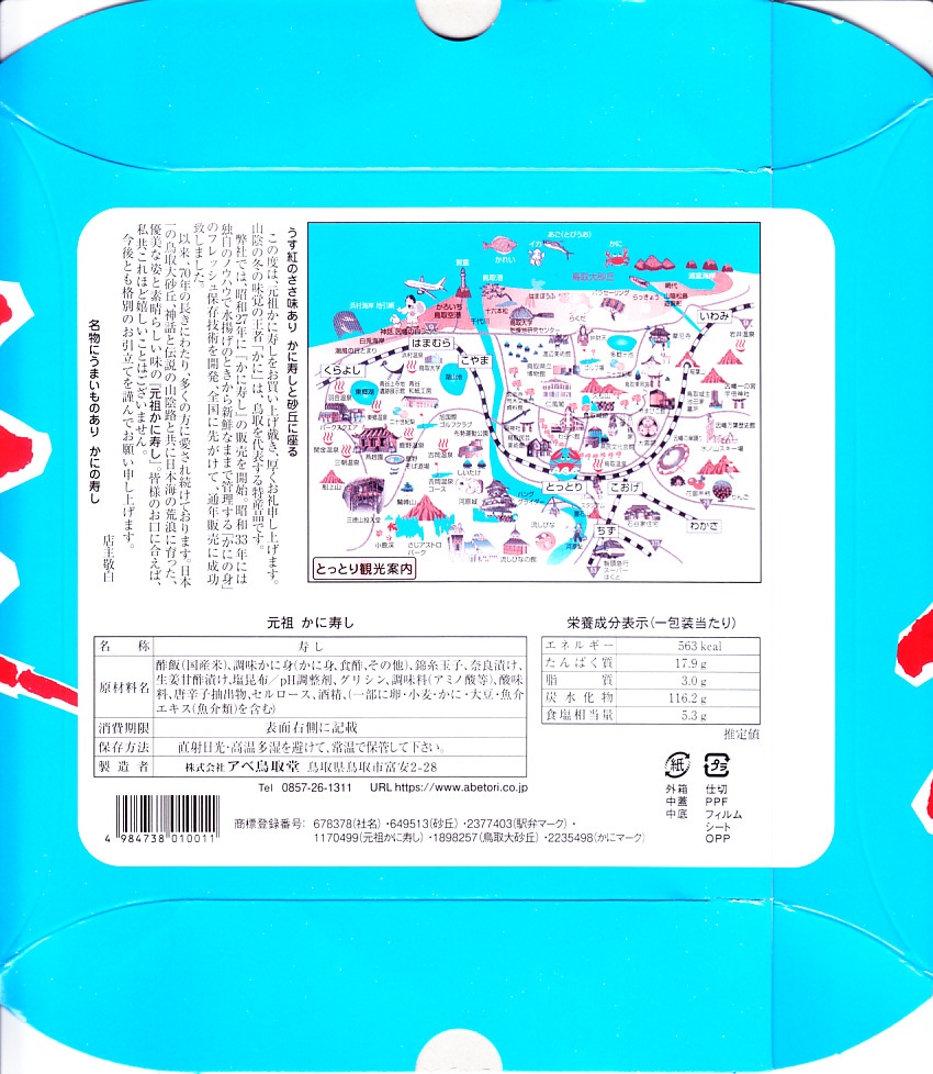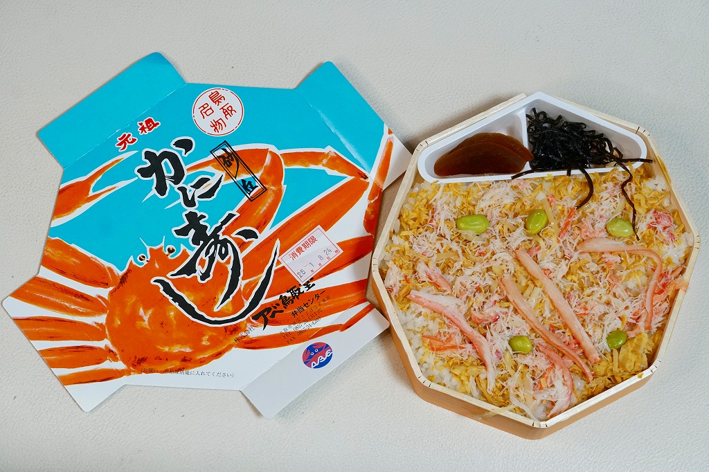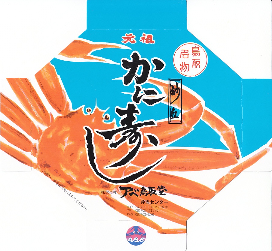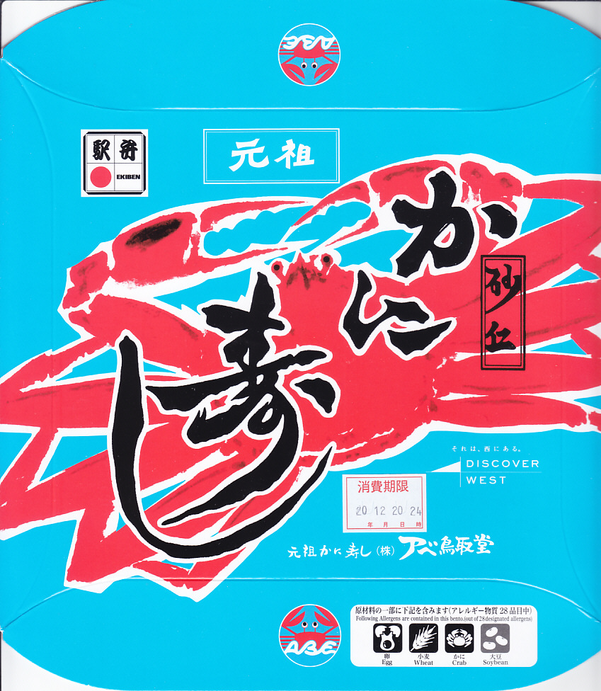 1952(昭和27)年11月に鳥取駅で発売された、カニ寿司の駅弁。1958(昭和33)年に保存技術の開発で一年中カニ駅弁を売るようになったのは、この鳥取駅弁が元祖である。カニを描いたボール紙のパッケージに、またカニを描いたふたをかける八角形の容器が入る。因幡米の酢飯を覆い隠すように、カニのほぐし身とカニ足が、錦糸卵とともに敷き詰められている。