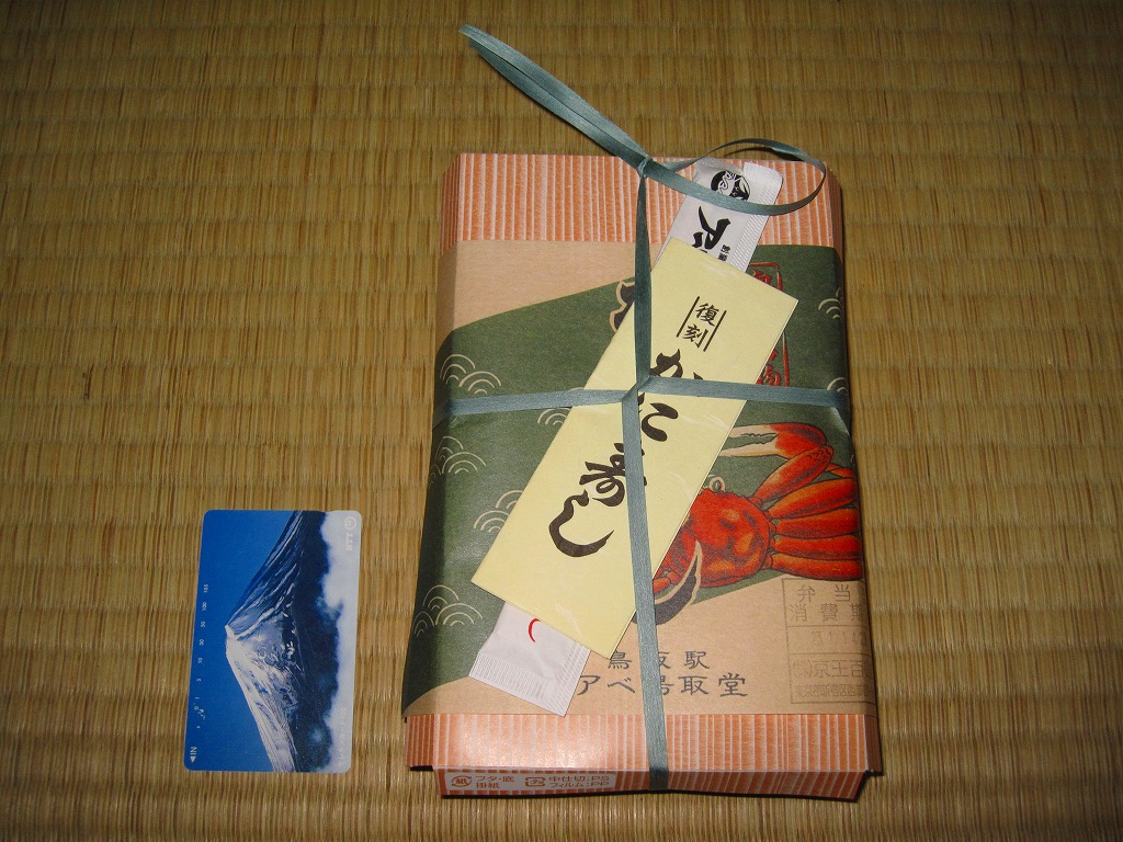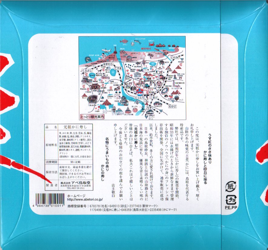 2004(平成16)年12月30日に購入した、鳥取駅弁のパッケージ。上記の2020年のものと、法定の表記を除き何も変わっていないことに驚く。イラストで紹介する鳥取の名所や名産にも、変化がないのだろう。