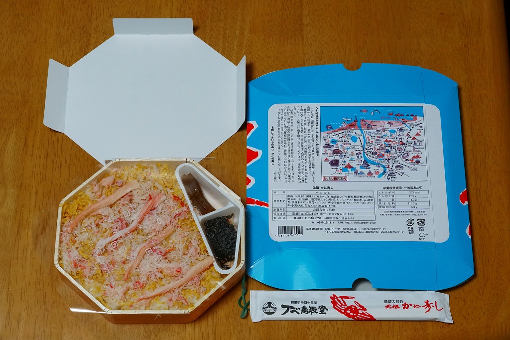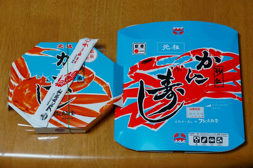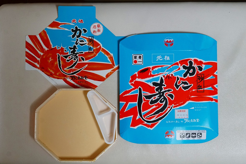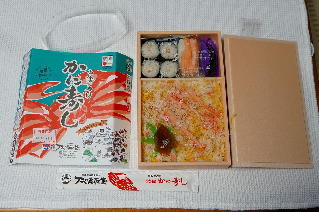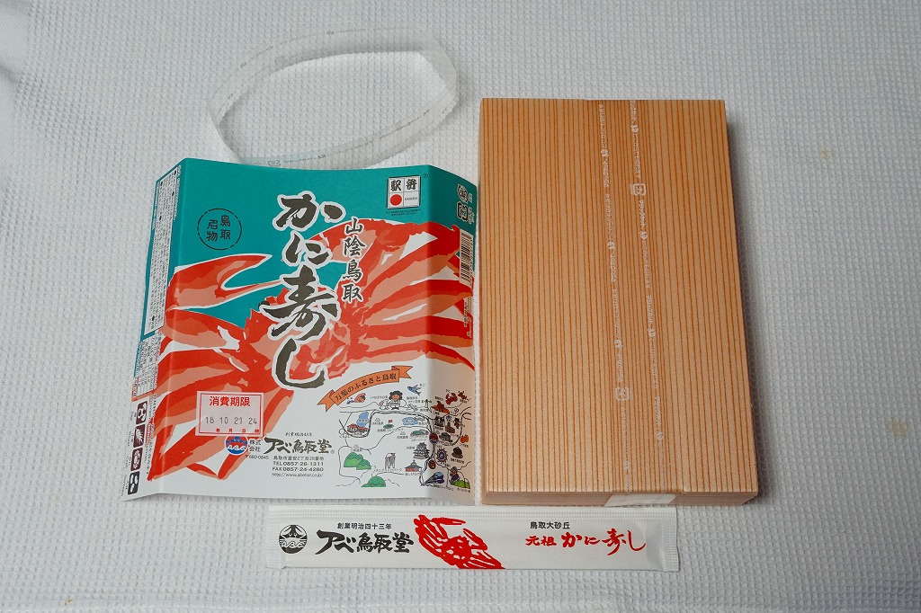 鳥取を代表する駅弁「元祖かに寿し」とは異なる、鳥取駅のカニ寿司駅弁。2012(平成24)年8月の東京駅の駅弁売店「駅弁屋 祭」オープンとともに発売した、東京限定の商品だろうか。四角い容器にかに寿し、かに細巻4個、かに握り1個、昆布を詰める端正な姿。飯とカニと少々の調味で構成する、輸送駅弁にありがちな豪華さや奇抜さを持たない奥ゆかしい姿に見えた。