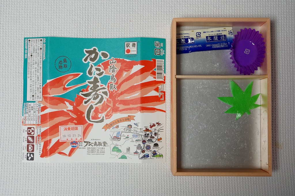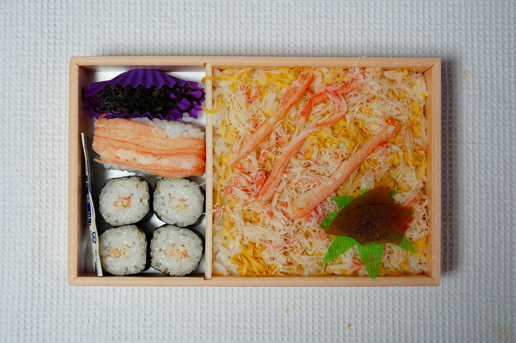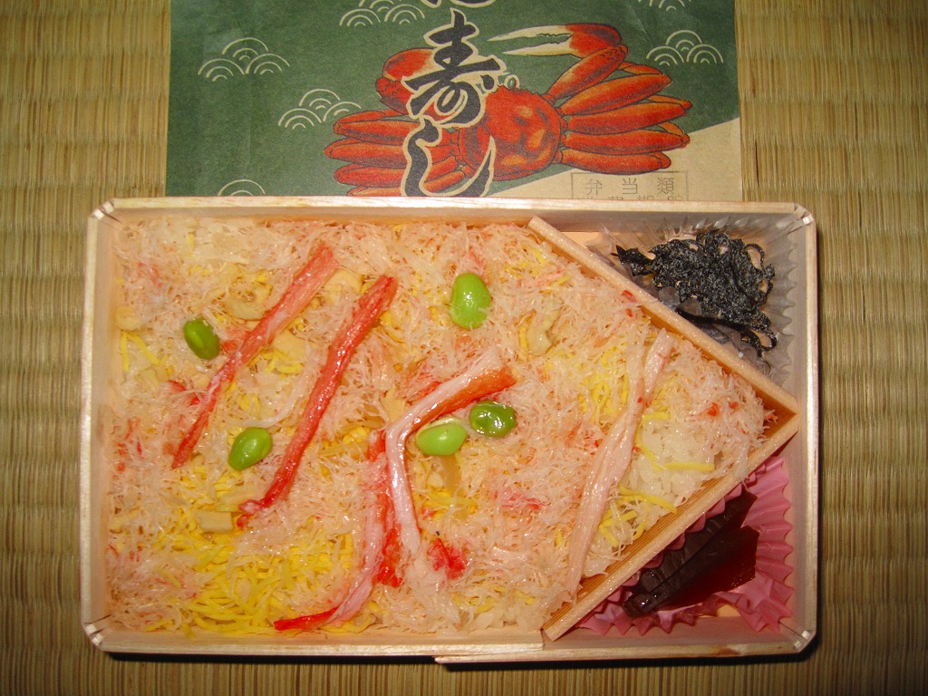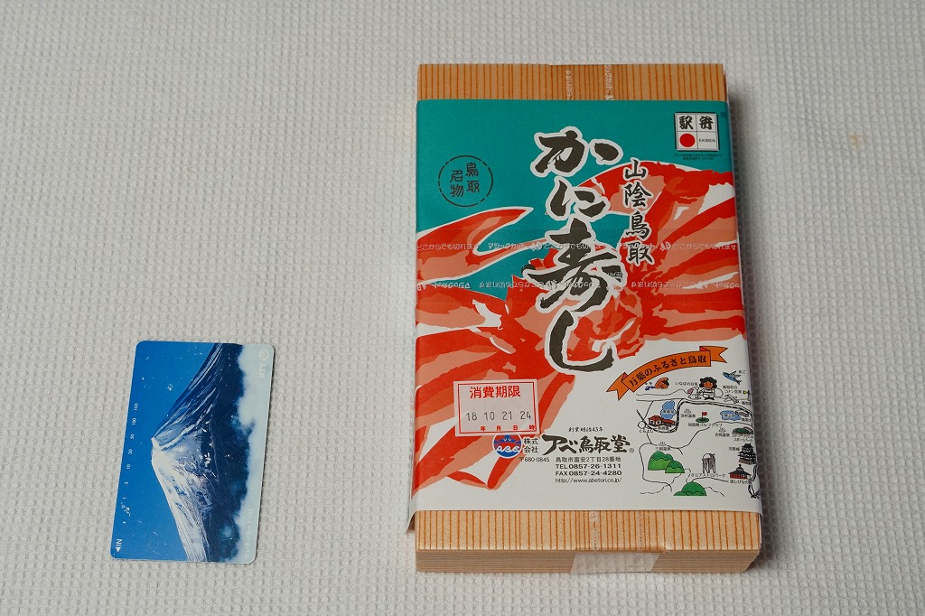 鳥取を代表する駅弁「元祖かに寿し」とは異なる、鳥取駅のカニ寿司駅弁。2012(平成24)年8月の東京駅の駅弁売店「駅弁屋 祭」オープンとともに発売した、東京限定の商品だろうか。四角い容器にかに寿し、かに細巻4個、かに握り1個、昆布を詰める端正な姿。飯とカニと少々の調味で構成する、輸送駅弁にありがちな豪華さや奇抜さを持たない奥ゆかしい姿に見えた。
