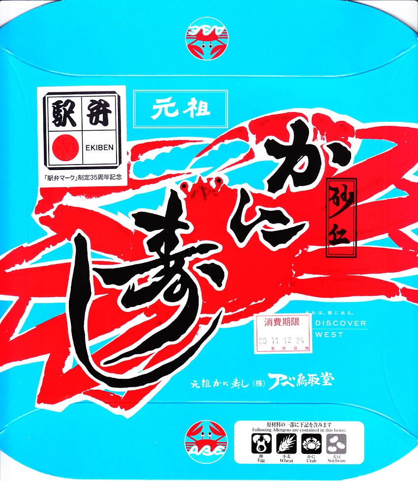 2023(令和5)年11月12日に購入した、鳥取駅弁のパッケージ。日本鉄道構内営業中央会の「駅弁マーク」制定35周年を記念し、会員のうち29社が主に11月10日から期間限定で販売した31種類の記念駅弁のうち、鳥取駅の駅弁屋のもの。既存の駅弁「元祖かに寿し」の紙箱に、大きめの駅弁マークのシールを貼り、各社共通のしおりを添付した。容器や中身や味や価格は、通常版と同じ。11月10日から当分の間販売。
