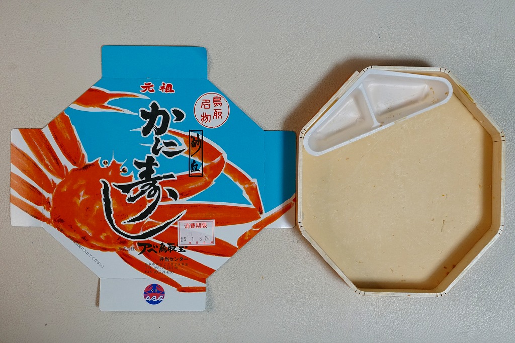 2025(令和7)年1月の京王百貨店の駅弁大会で輸送販売。「第1回大会ベスト5復刻かけ紙」として、1966年の第1回大会で第1位の鳥取駅「かに寿し」と第2位の黒磯駅「九尾釜めし」と第3位の新津駅「えびめし」と第4位の森駅「いかめし」と第5位の浜松駅「うなぎ飯」を、当時の掛紙をかけて販売した。これはその鳥取駅版。青地にカニの絵柄は当時も現在も変わらないとはいえ、現物は現行版の外箱を省いただけ。ひもで十字にしばって、中身に枝豆を散らして「復刻」としたのだろう。中身はカニの名前を除き当時も今も同じ。価格は現行の通常版と同じ。