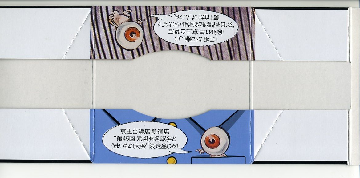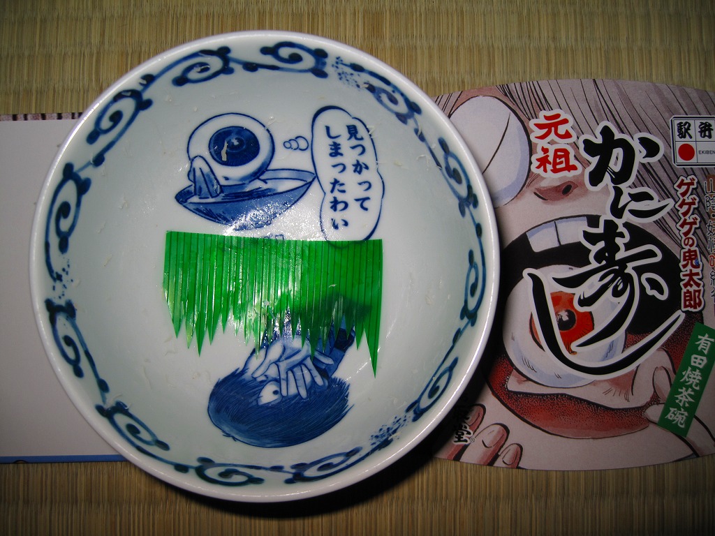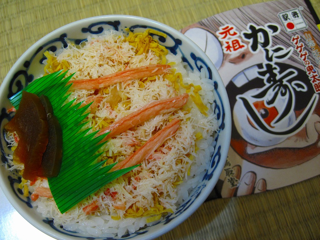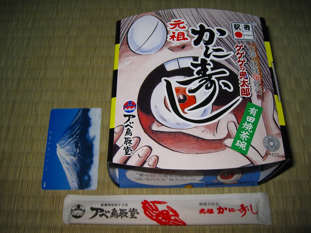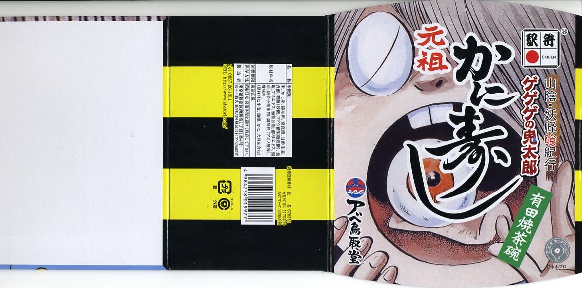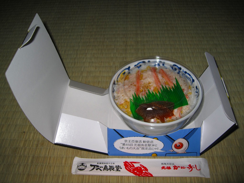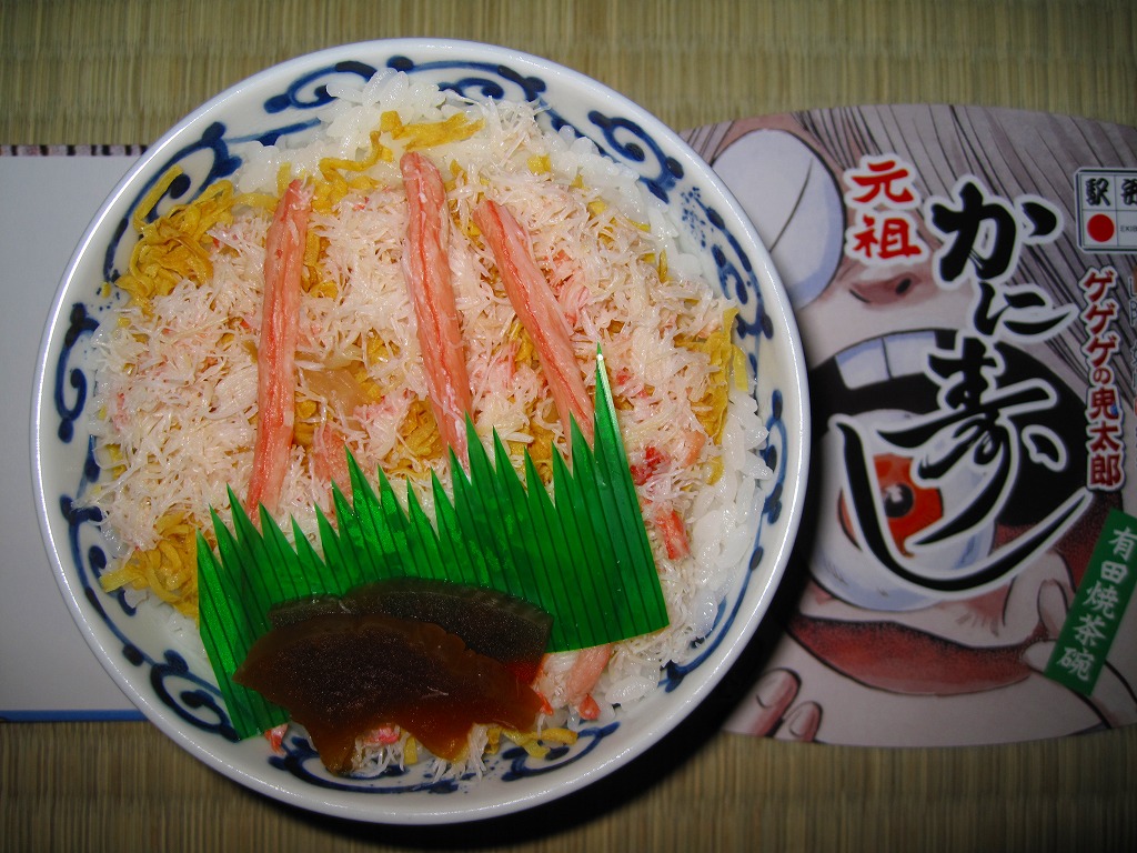 2010年1月の京王百貨店の駅弁大会で販売された催事向け商品。容器は「ゲゲゲの鬼太郎風呂茶漬け」のものを、中身は鳥取の名物駅弁「元祖かに寿し」のものを、それぞれ使って組み合わせた複合商品。専用に起こされたパッケージには、元祖かに寿しが1966(昭和41)年の京王百貨店の駅弁大会で第1位を取ったことと、この商品が今回の京王百貨店駅弁大会の限定品であることが記される。話題にはならなかったけれど、楽しい試みであった。