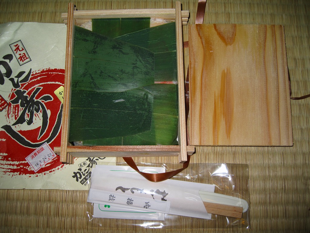 2010年5月の調製元の創業百周年を記念して、そしておそらく京王百貨店駅弁大会に合わせて、2010(平成22)年11月6日に発売した、鳥取駅の名物駅弁「元祖かに寿し」の復刻版。1952(昭和27)年の発売時の姿を再現したという。経木折をイメージしたと思う経木枠の長方形の容器に木目を印刷したボール紙でふたをして、渋いデザインの掛紙をかける。