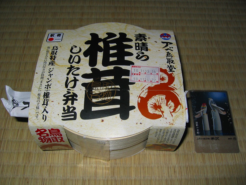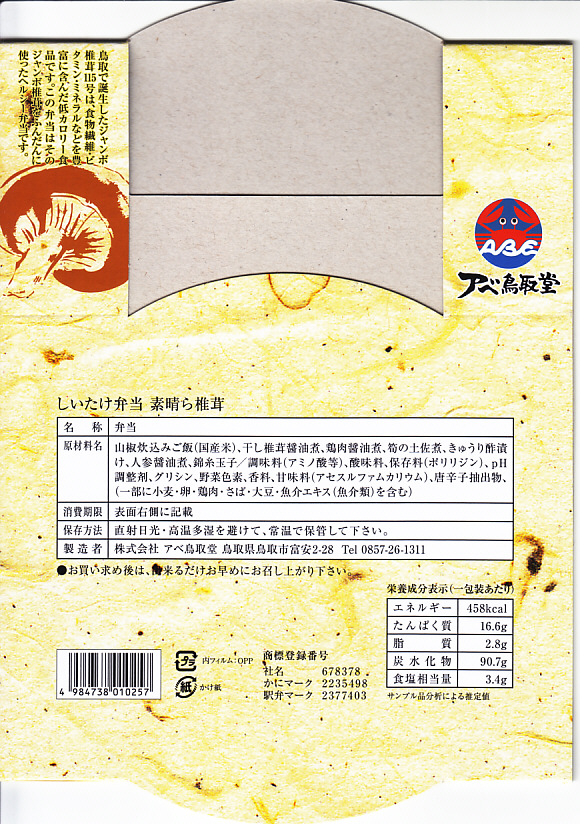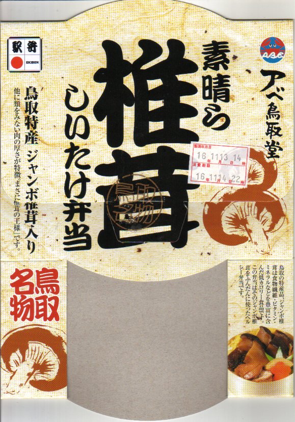 この駅弁に使われる「ジャンボ115号椎茸」ないし「ジャンボ椎茸115号」は、鳥取県鳥取市の一般財団法人日本きのこセンターの菌蕈(きんじん)研究所が開発し、1981(昭和56)年に種苗法に基づく農林水産大臣の品種登録を受けた原木シイタケ。うまく育てれば大型で肉厚になることが特徴で、鳥取県では傘の直径8センチ以上などいくつかの規格を満たすと「鳥取茸王」、傘の直径5センチ以上で「とっとり115」とする。他県でも栽培され、異なる名前で販売される。