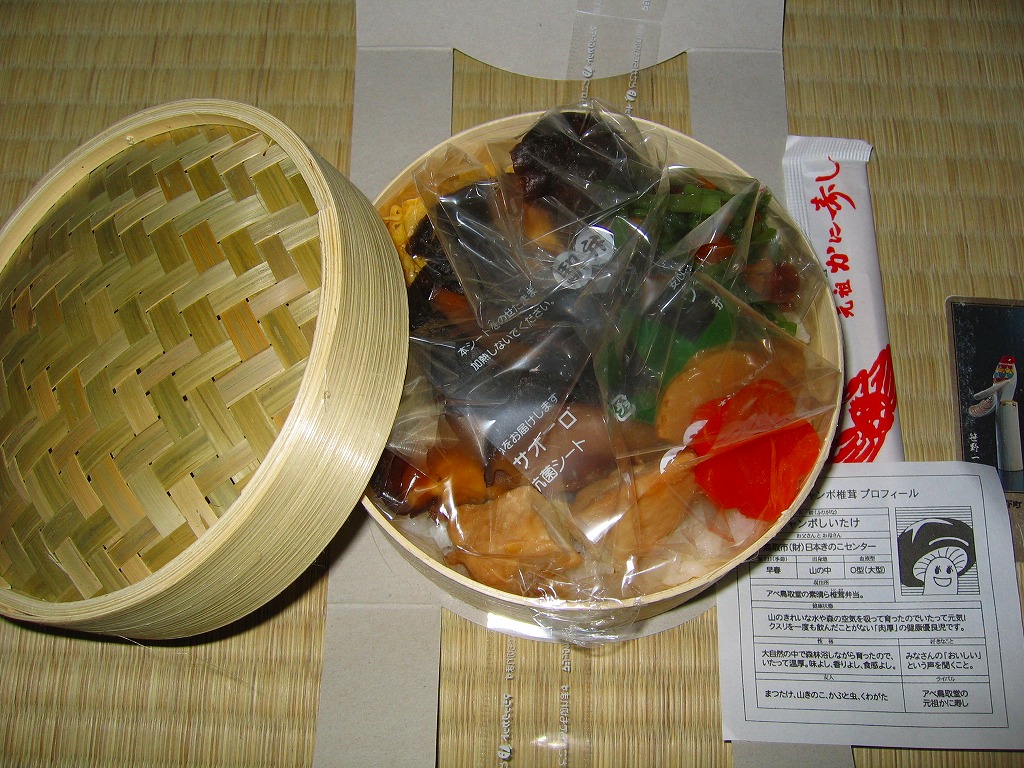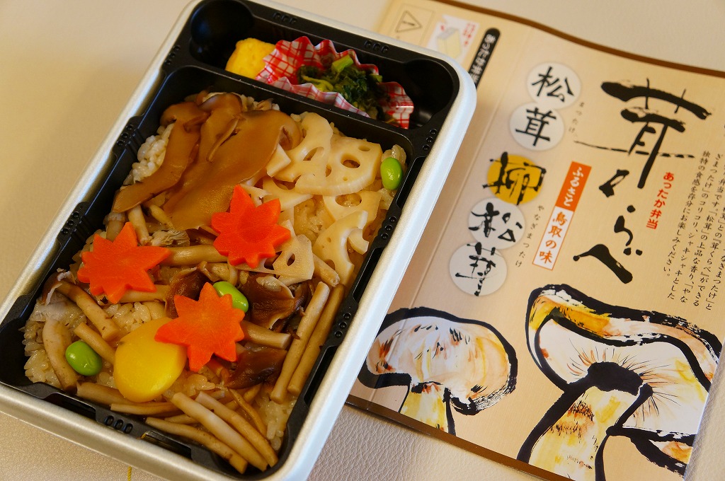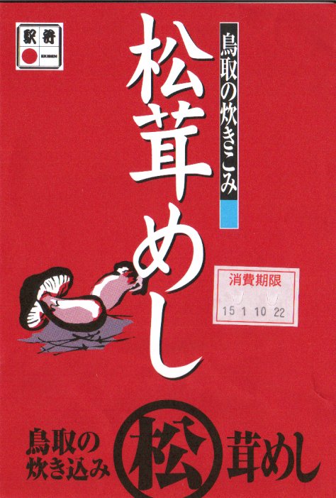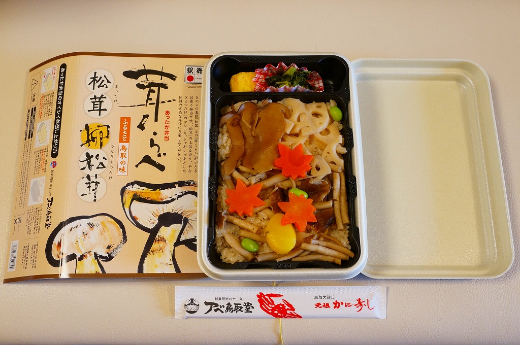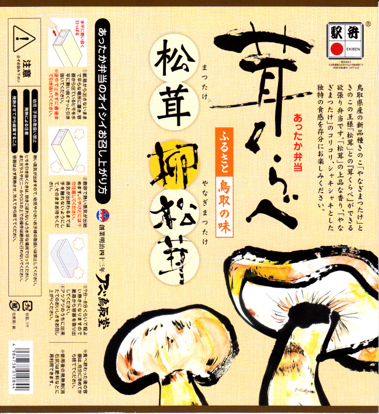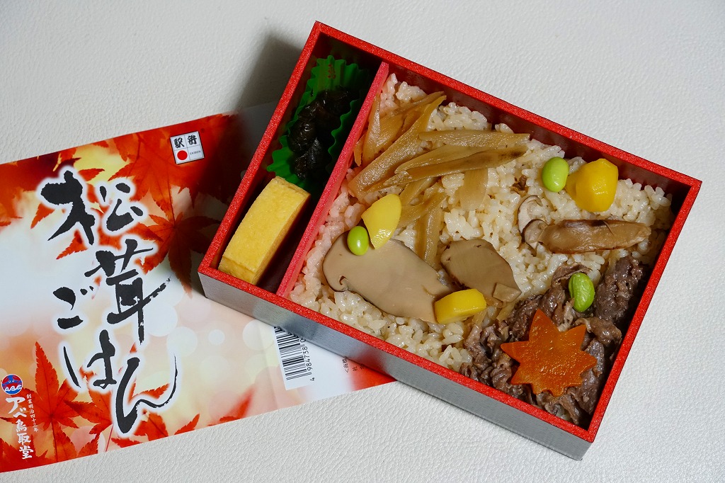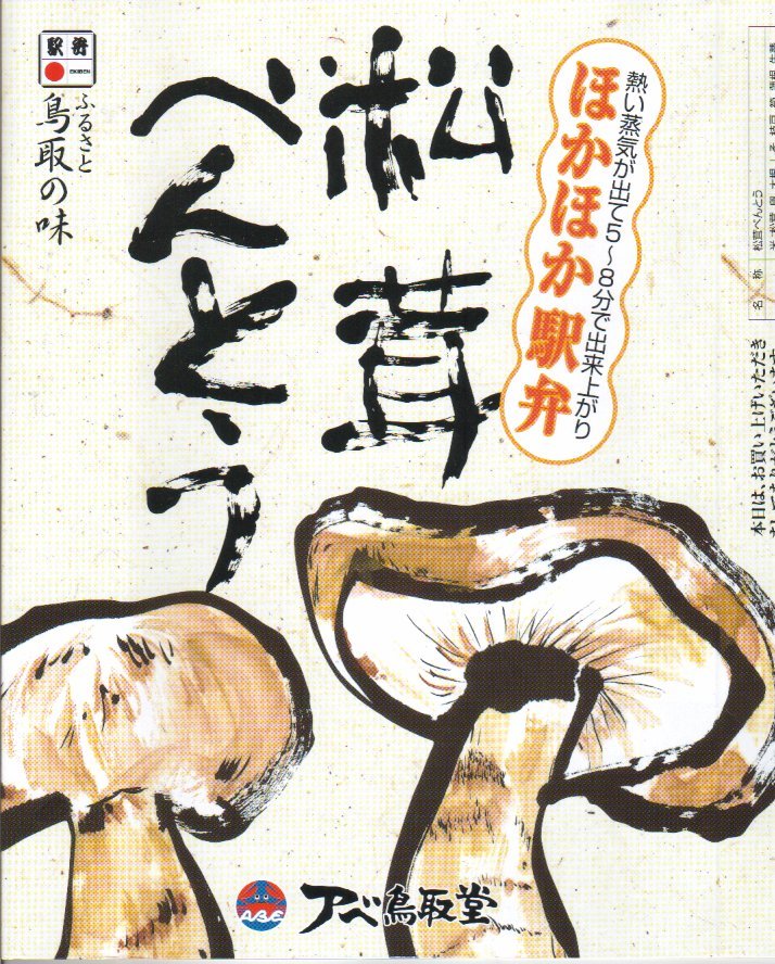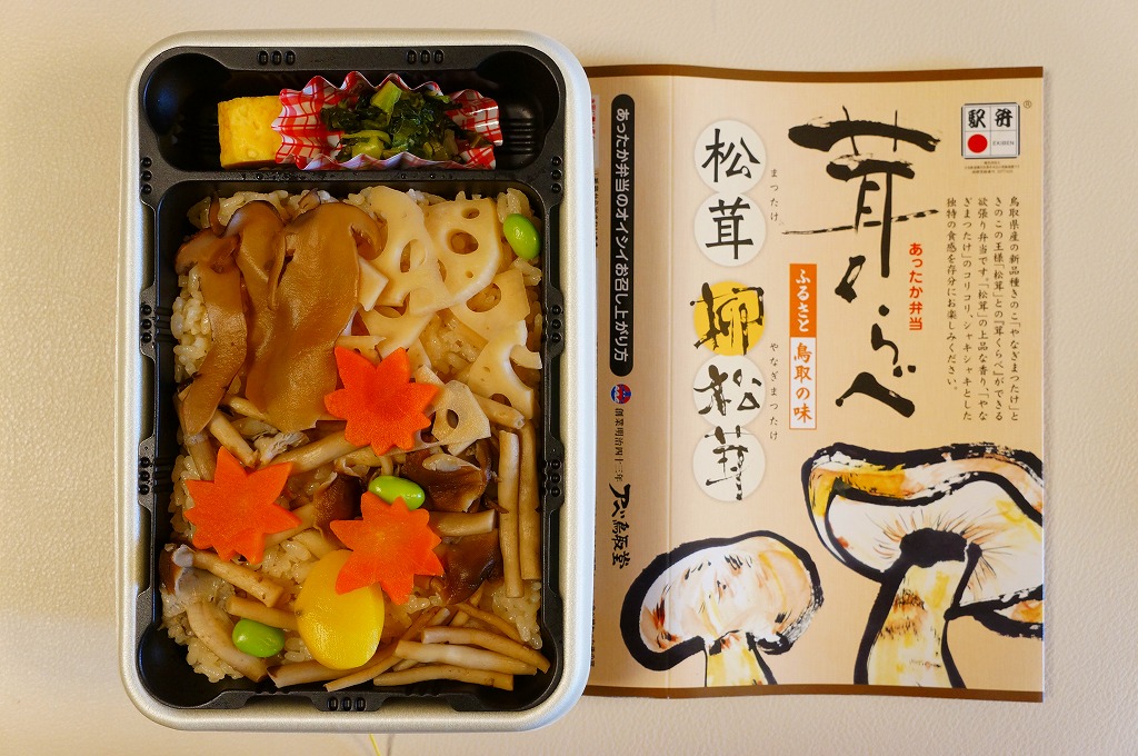 鳥取駅弁で初めて、ひもを引くと8分程度で暖まる加熱機能付き容器を使う。中身は味付け御飯の中と上にスライス松茸が載り、殻付き海老や煮物類に付け合わせが添えられる、容器を別にすれば全国各地で見られる松茸駅弁。「元祖かに寿し」に飽きたらこちらをいただこう。価格は2001年の購入時で1,000円、後に1,100円、2011年の鶴屋百貨店の駅弁大会で終売か。