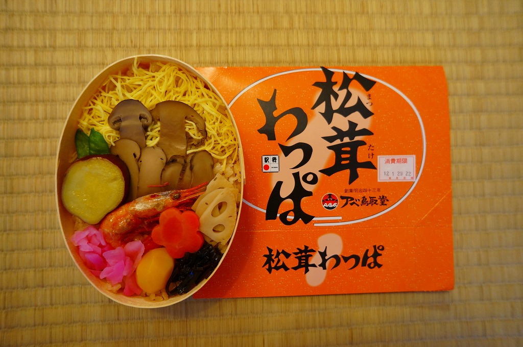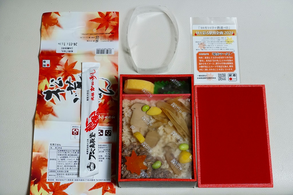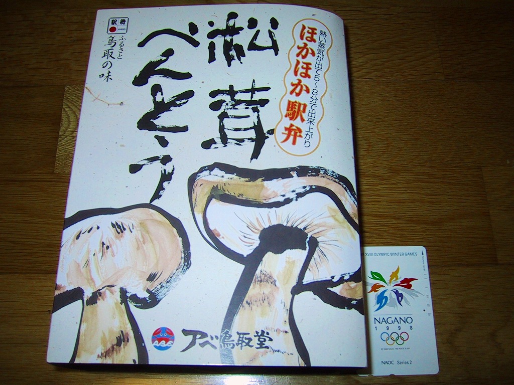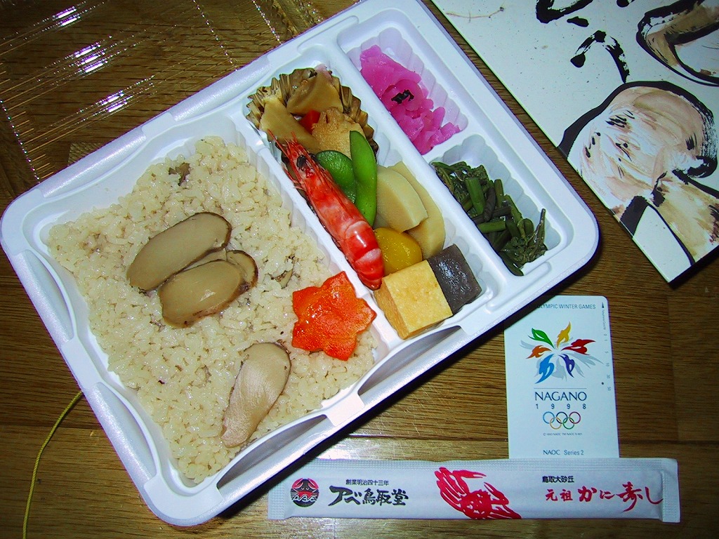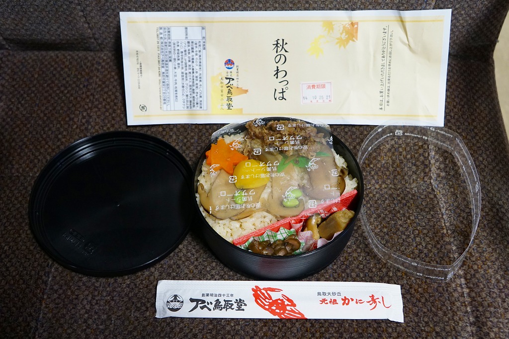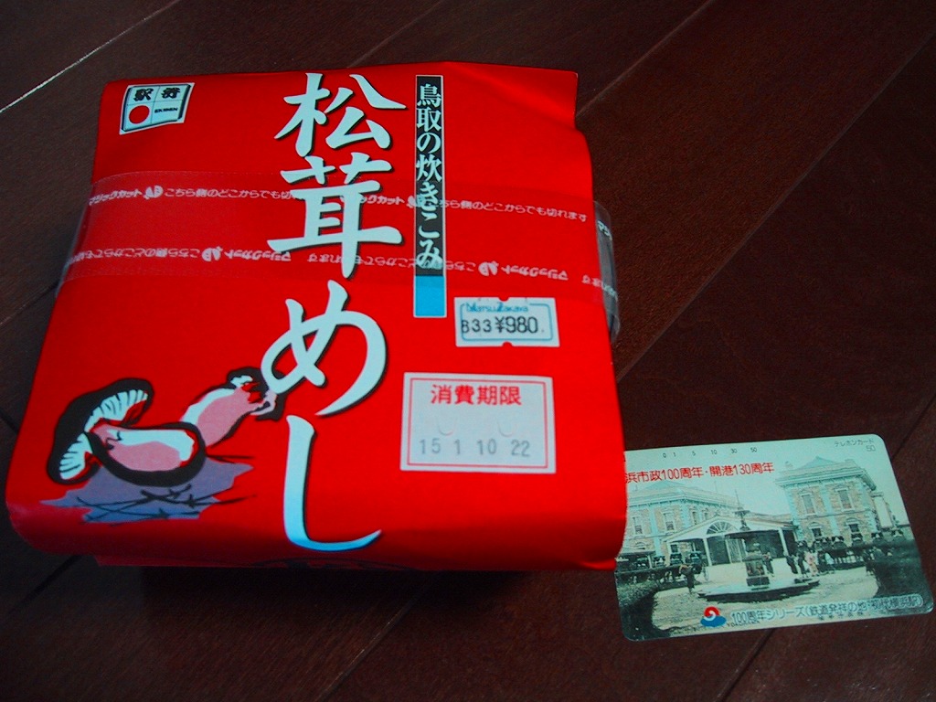 鳥取駅弁で初めて、ひもを引くと8分程度で暖まる加熱機能付き容器を使う。中身は味付け御飯の中と上にスライス松茸が載り、殻付き海老や煮物類に付け合わせが添えられる、容器を別にすれば全国各地で見られる松茸駅弁。「元祖かに寿し」に飽きたらこちらをいただこう。価格は2001年の購入時で1,000円、後に1,100円、2011年の鶴屋百貨店の駅弁大会で終売か。