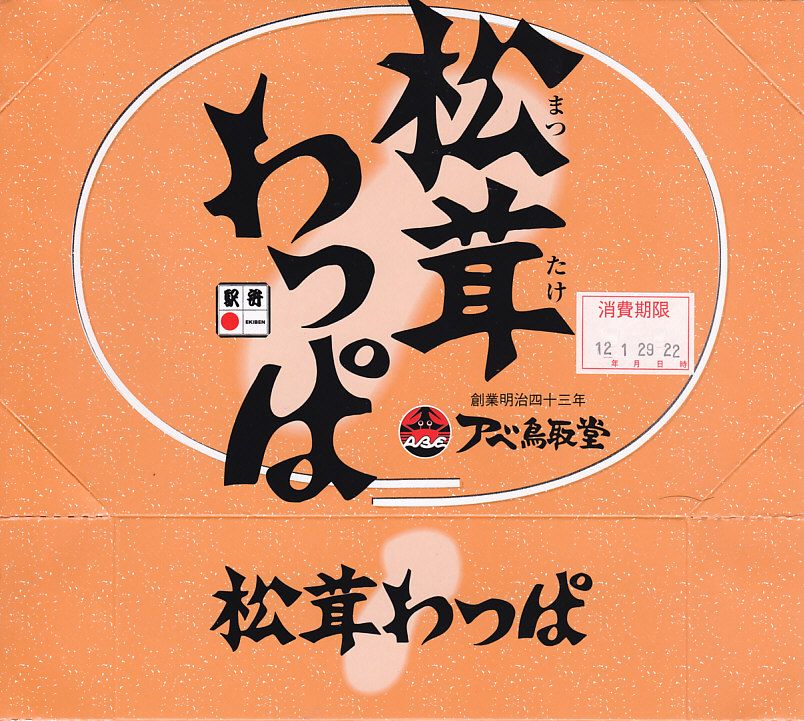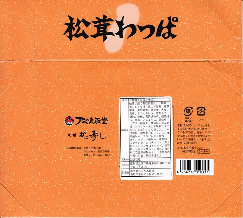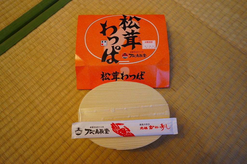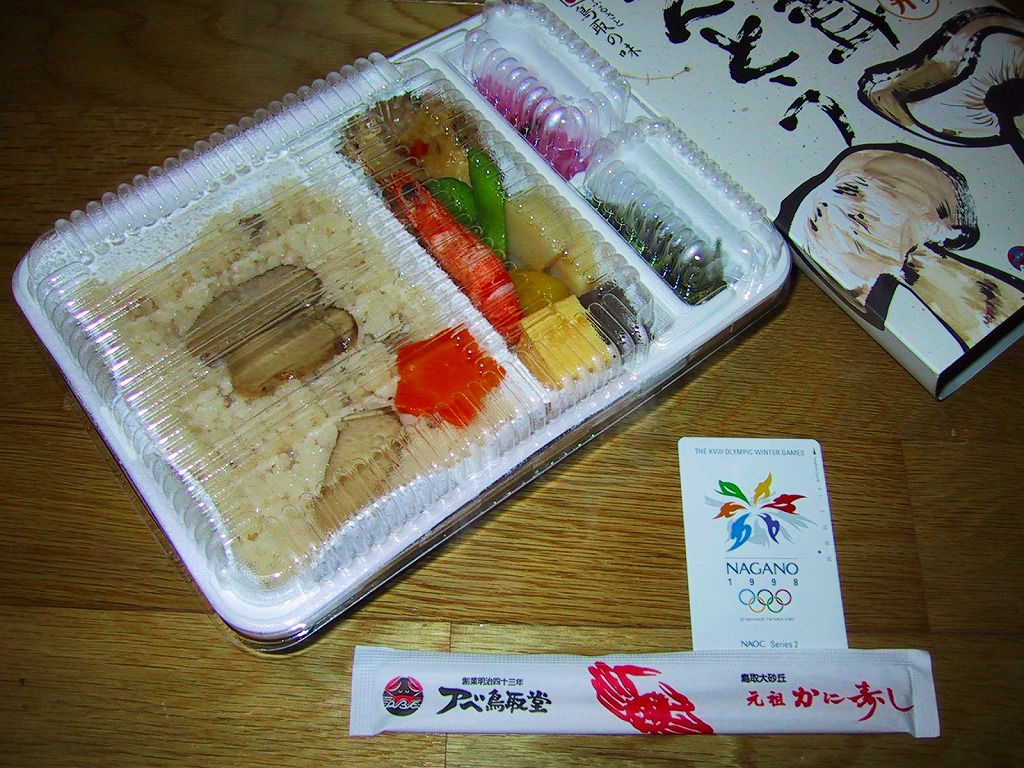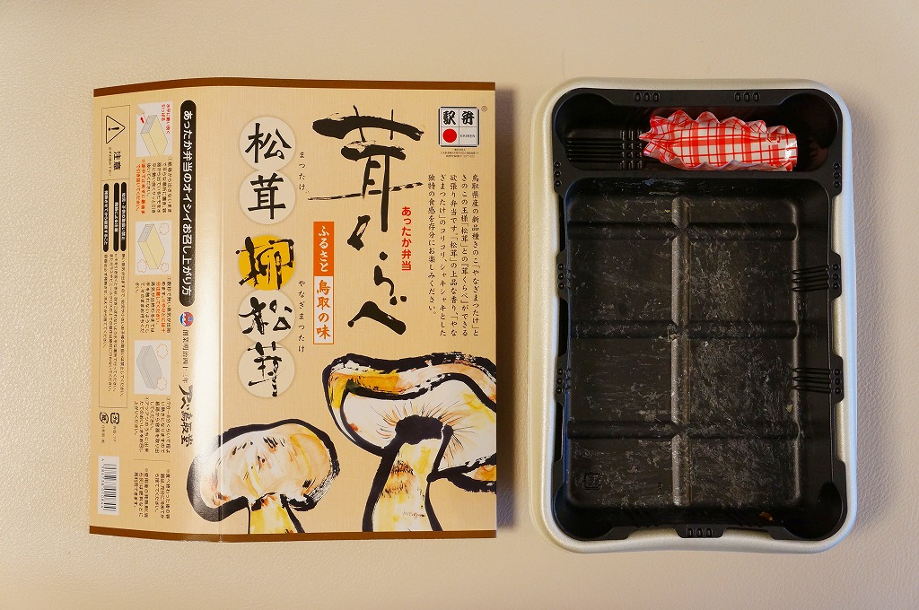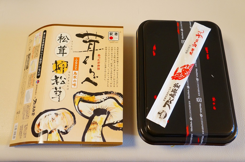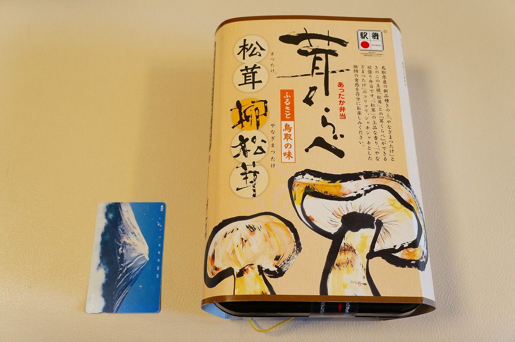 鳥取駅弁で初めて、ひもを引くと8分程度で暖まる加熱機能付き容器を使う。中身は味付け御飯の中と上にスライス松茸が載り、殻付き海老や煮物類に付け合わせが添えられる、容器を別にすれば全国各地で見られる松茸駅弁。「元祖かに寿し」に飽きたらこちらをいただこう。価格は2001年の購入時で1,000円、後に1,100円、2011年の鶴屋百貨店の駅弁大会で終売か。