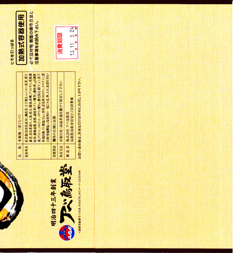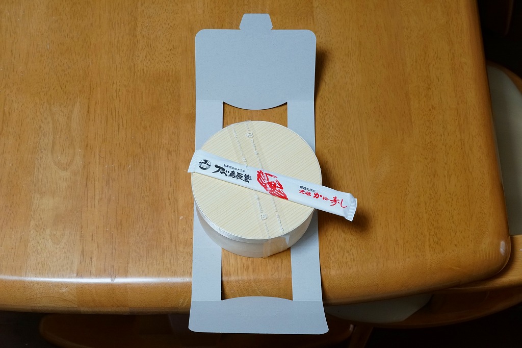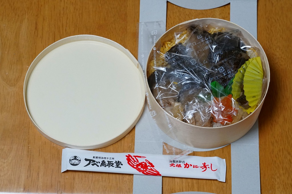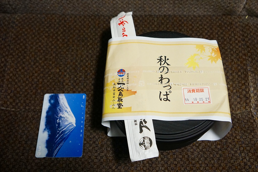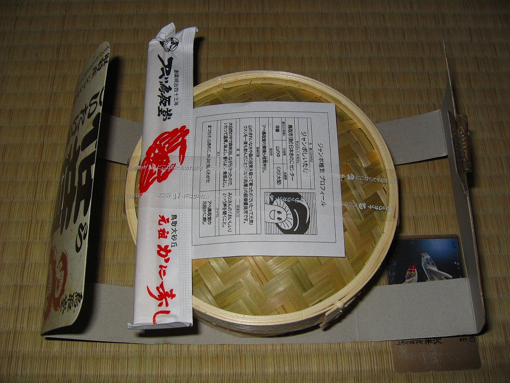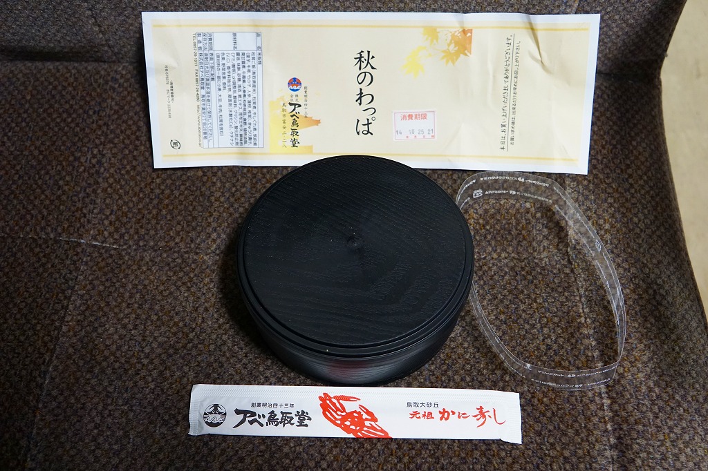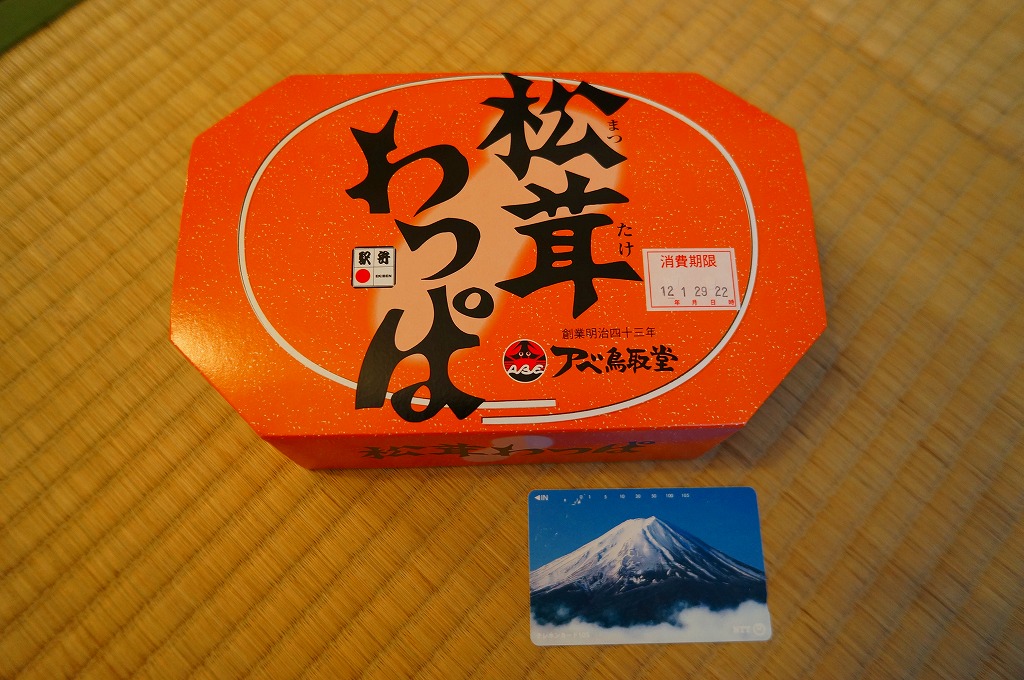 鳥取駅弁で初めて、ひもを引くと8分程度で暖まる加熱機能付き容器を使う。中身は味付け御飯の中と上にスライス松茸が載り、殻付き海老や煮物類に付け合わせが添えられる、容器を別にすれば全国各地で見られる松茸駅弁。「元祖かに寿し」に飽きたらこちらをいただこう。価格は2001年の購入時で1,000円、後に1,100円、2011年の鶴屋百貨店の駅弁大会で終売か。