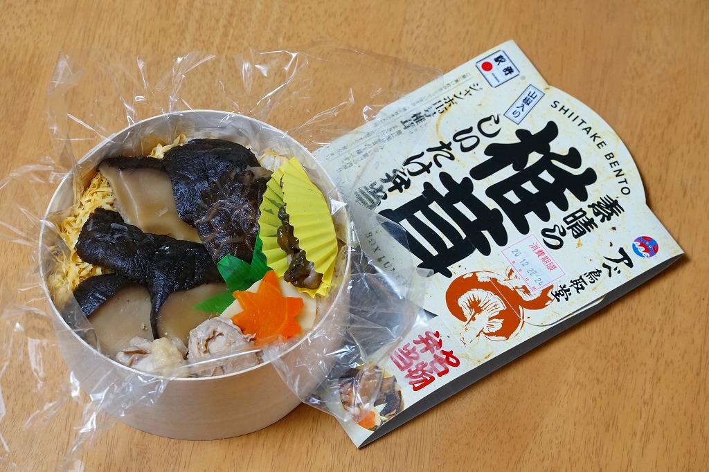 2004(平成16)年8月に発売。真ん丸の容器に山椒の炊込飯を詰め、大きくて肉厚のシイタケ煮を載せ、鶏肉煮、タケノコ煮、ニンジン煮、きゅうり酢漬けを添える。気持ち悪いほど大きなメインの椎茸には、意外にも普通の椎茸と同等以上のうまみが詰まっていて、駅弁に稀な椎茸丼としてモリモリ食べられる。