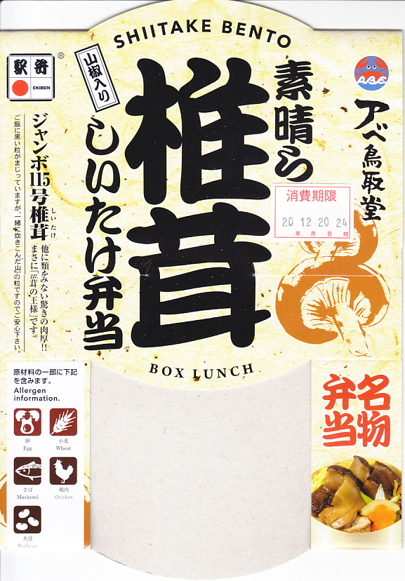 上記の駅弁「素晴ら椎茸しいたけ弁当」の、2004(平成16)年時点、発売時点での姿。値段、椎茸の名前、容器のふたの形状、山椒でなく餅米を混ぜた御飯が、上記の16年後と異なる。逆にそれくらいしか違いのない、駅弁らしいロングセラー商品となった。