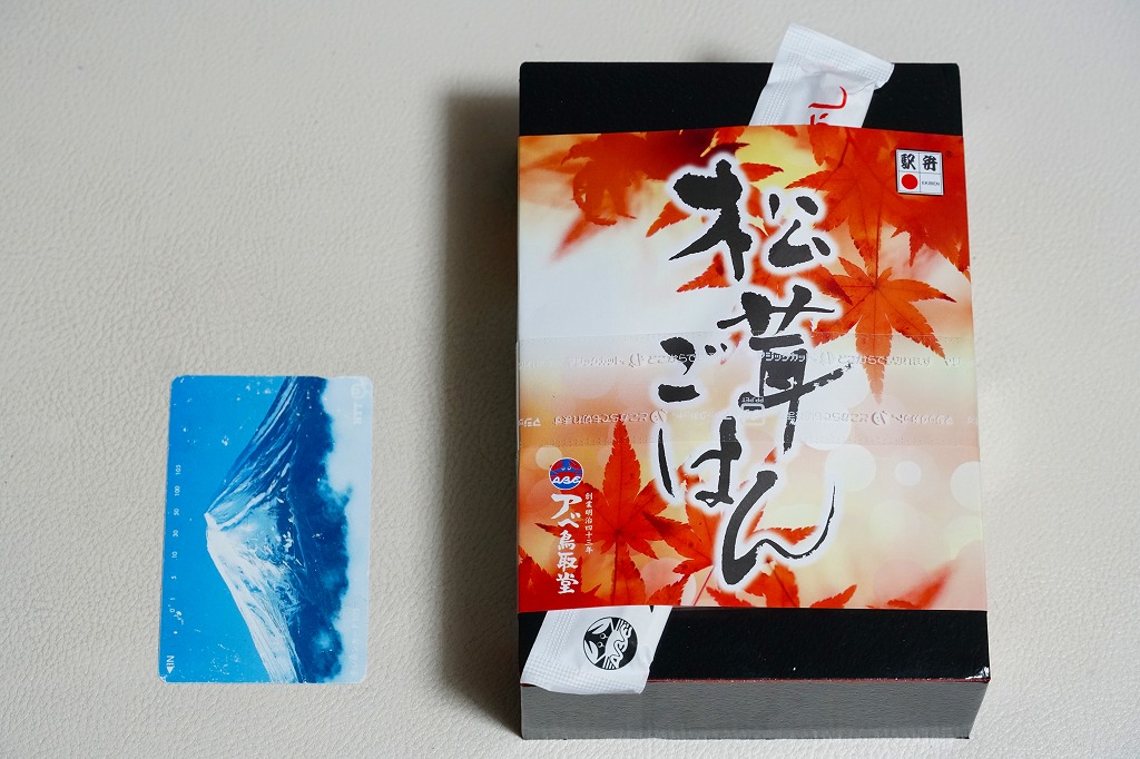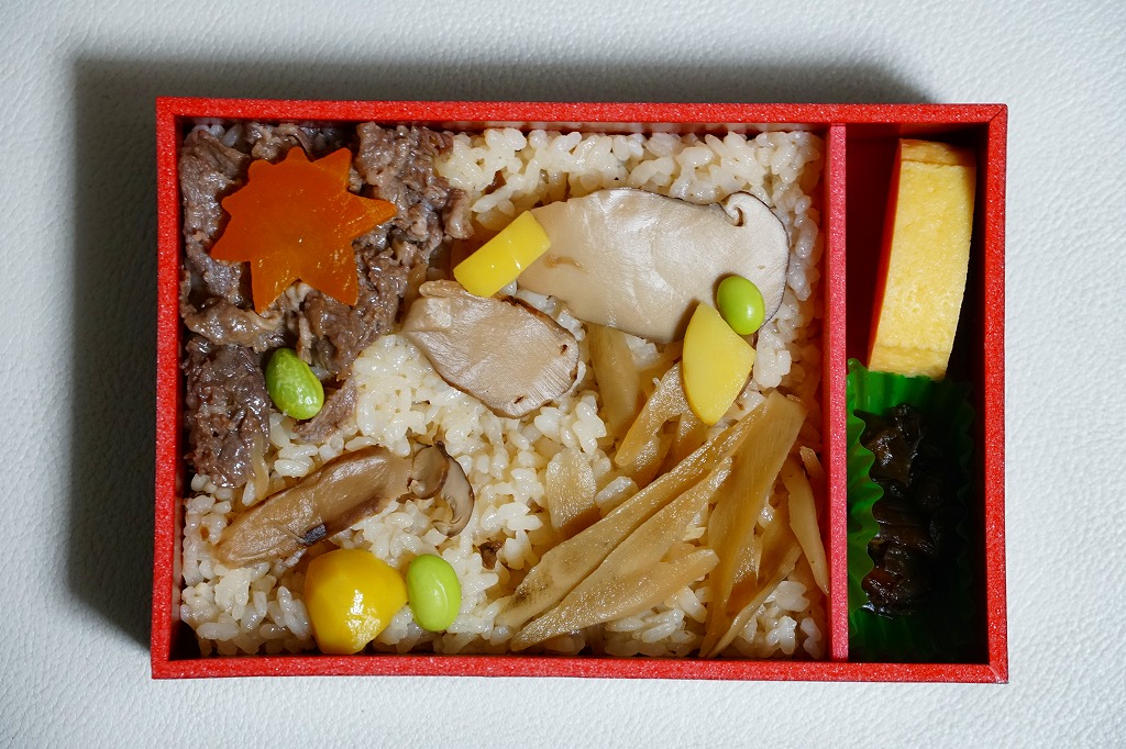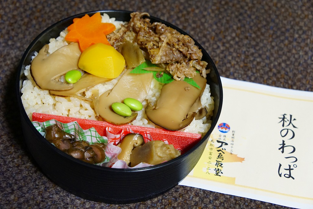 2000年代の駅弁「松茸わっぱ」を置き換えて、2020(令和2)年に発売か。これは秋季の駅弁か、催事向けの商品か。東京駅の季節のおこわ駅弁と同じような長方形の容器に、マツタケとマイタケの炊き込み御飯を詰め、マツタケのスライス煮、牛しぐれ煮、ささがきごぼうを載せ、枝豆とにんじんとクリで彩り、きゅうりの醤油漬けと玉子焼を添える。マツタケの視覚と牛肉の味覚で茶飯をいただく、松茸飯というよりは炊込飯タイプのお弁当に思えた。価格は2020年時点で1,000円、2024年時点で1,250円。