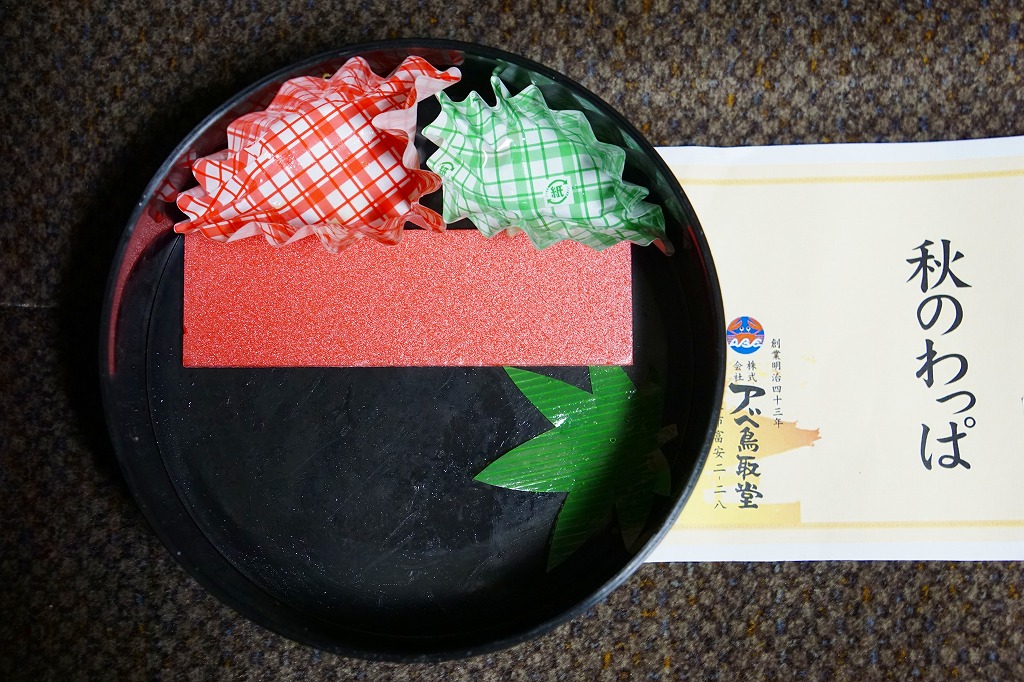 鳥取駅の秋の駅弁で、9〜11月の販売。2014(平成26)年のものは、黒く丸く硬いプラ製の容器に松茸飯を詰め、マツタケのスライスと牛しぐれ煮を貼り、クリ、ニンジン、筑前煮、柴漬けなどを添えていた。価格は2014年の購入時で920円、2018年時点で中身を変えて950円。季節のわっぱシリーズは2019年の春までの実施か。
