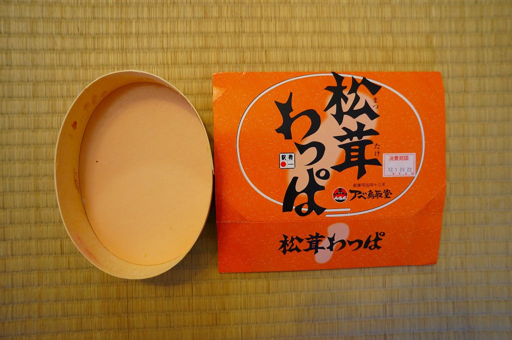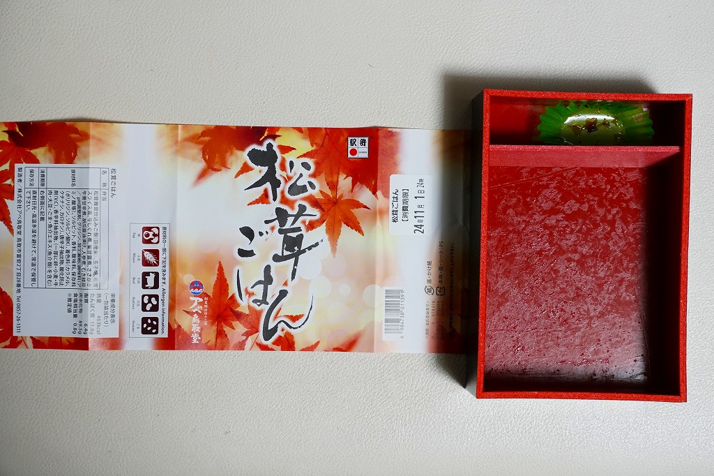 2012(平成24)年1月の阪神百貨店の駅弁大会で初めて見たが、商品そのものはその10年以上前から存在していた模様。薄い木でできた楕円形の容器を、社名と商品名くらいしか書いてないシンプルすぎるデザインのボール紙の枠にはめる。中身は茶飯の上を業務用錦糸卵、マツタケ煮のスライス、さつまいも、有頭海老揚げ、レンコン、ニンジン、クリ、昆布、大根桜漬で覆うもの。冬季の輸送販売で御飯がカチカチになっていたものの、普通にうまいマツタケ駅弁だった。価格は2012年の購入時で1,000円、2018年時点で1,100円。2020年に「松茸ごはん」(1,000円)に交代か。