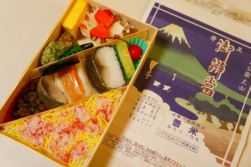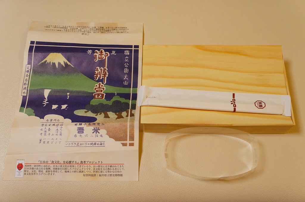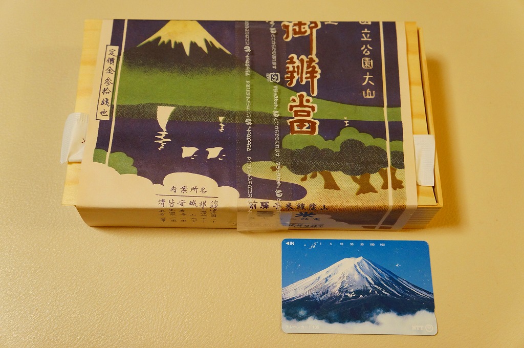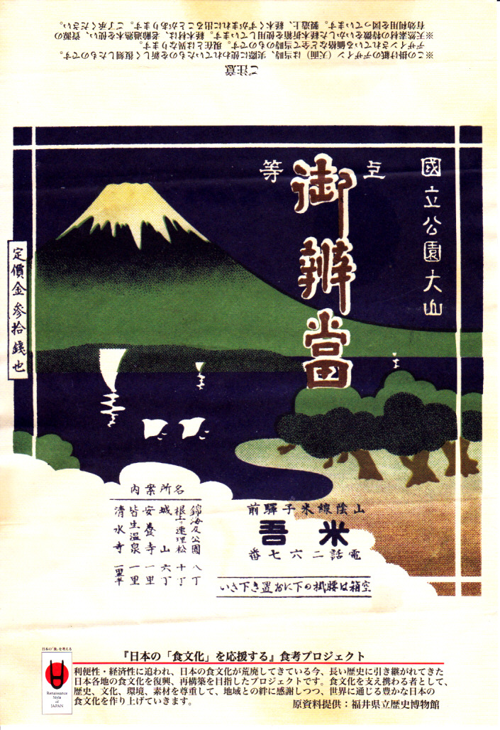 1930年代のものと思われる、昔の米子駅弁の掛紙。だから描かれる山は大山(だいせん)で、弓ヶ浜半島から美保湾越しの風景だろう。その姿はまるで富士山であり、三保半島から駿河湾越しの風景と言われたら信じそう。
