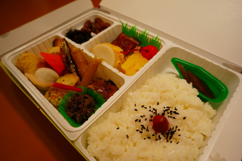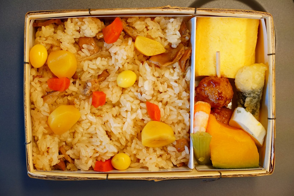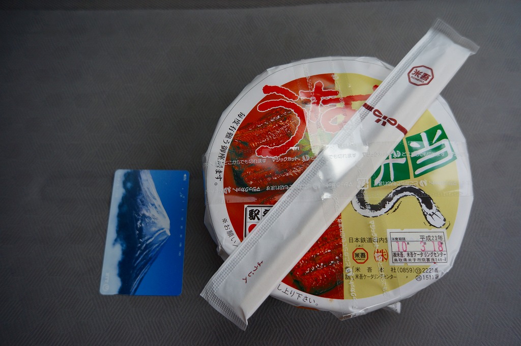 米子駅の幕の内駅弁。駅弁の名前を書いた専用のボール紙箱を使用、白いプラ製トレーに収まる中身は、日の丸御飯に奈良漬、かまぼこと玉子焼とうなぎ蒲焼、シジミ煮、マス唐揚、ワカサギ甘露煮、ニンジンやサトイモなどの煮物、焼サバ、ちくわ磯部揚、ひじき煮、煮豆、パインとチェリーなど。初見は仕出し弁当風も、多種のおかずの味が常温で生きる駅弁の鑑。価格は2010年時点で920円、2014年4月の消費税率改定で950円、2020年時点で970円、2023年時点で1,188円。