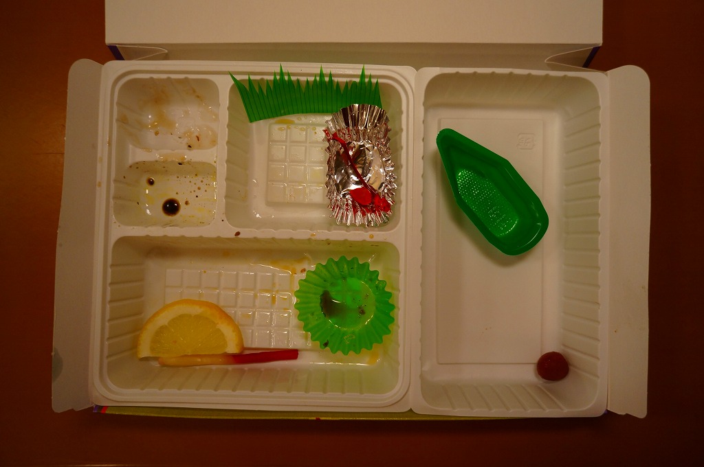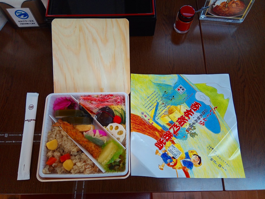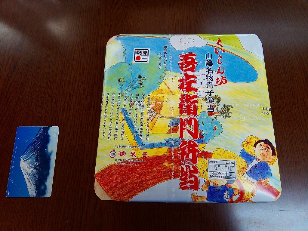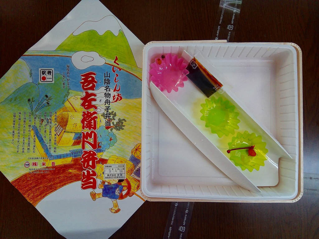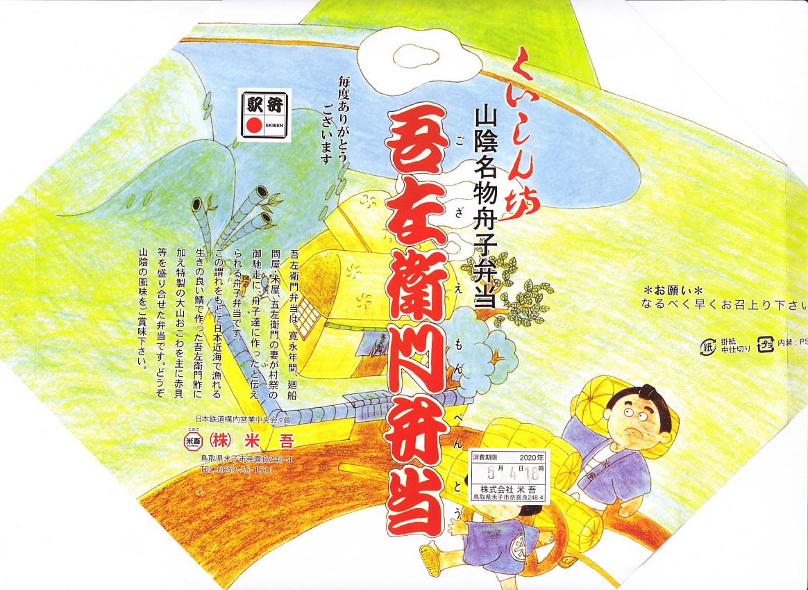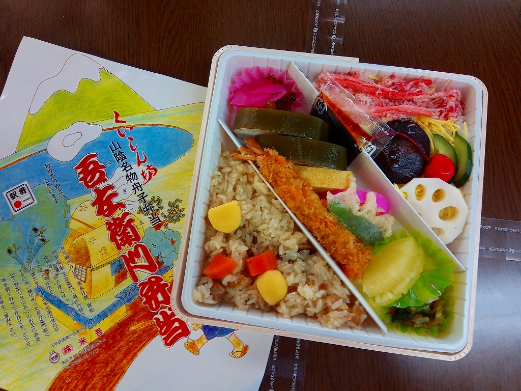 「くいしん坊」や「山陰名物舟子弁当」の副題が見える。掛紙によると、寛永年間、廻船問屋・米屋、吾左衛門の妻が村祭の御馳走に、舟子達に作ったと伝えられる舟子弁当だそうな。ふたまで経木折なのに、白いプラ製トレーにすべて収めた中身は、山菜おこわ、カニ寿司、吾左衛門鮓鯖、エビフライ、かまぼこと玉子焼、漬物などで、御飯たっぷりの内容。名前からして幕の内駅弁かと思ったら、そうではなかった。