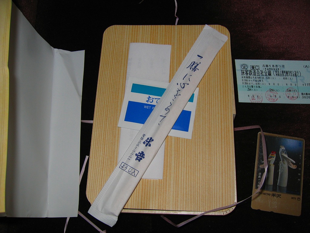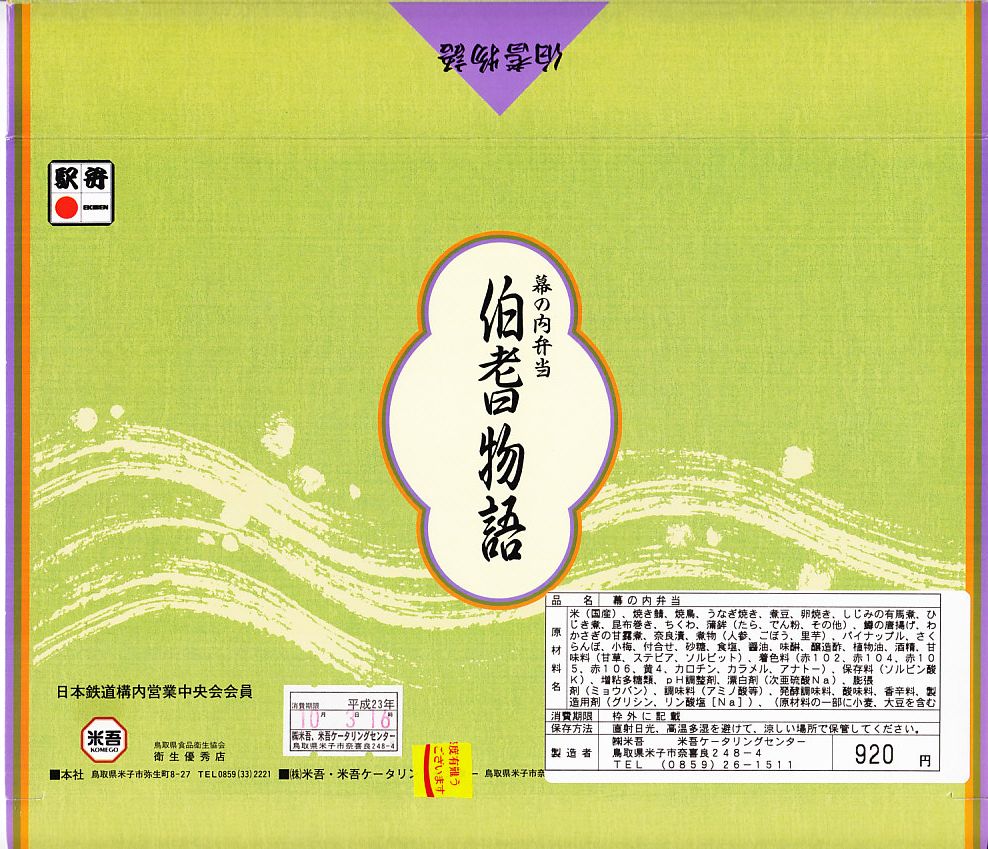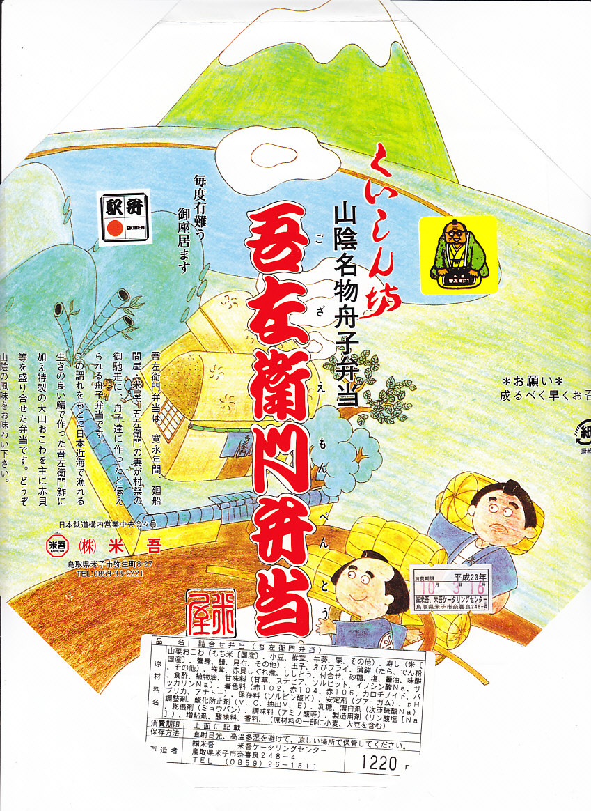 2011(平成23)年10月3日に購入した、米子駅弁の掛紙。上記の2020年のものと同じで、容器や中身も同じ。よく見比べると、2つのロゴマークの有無、調製元の所在地、「毎度ありがとうございます」の表記に差異がある。