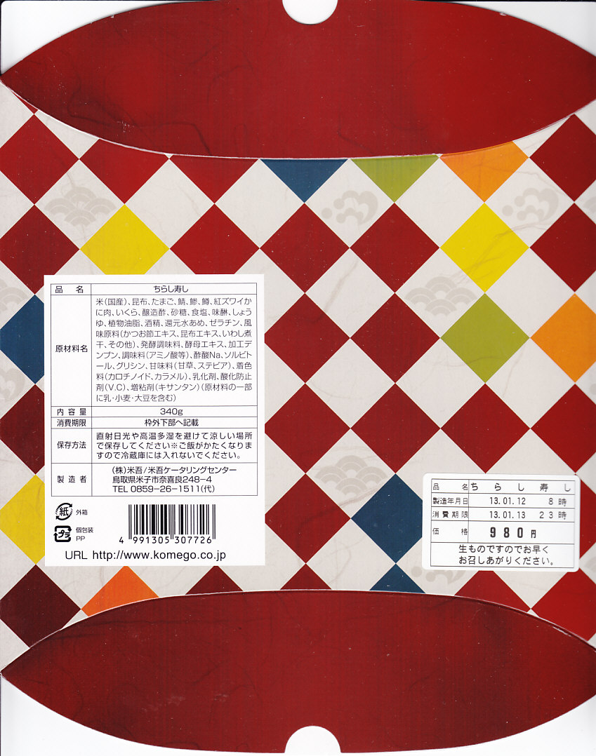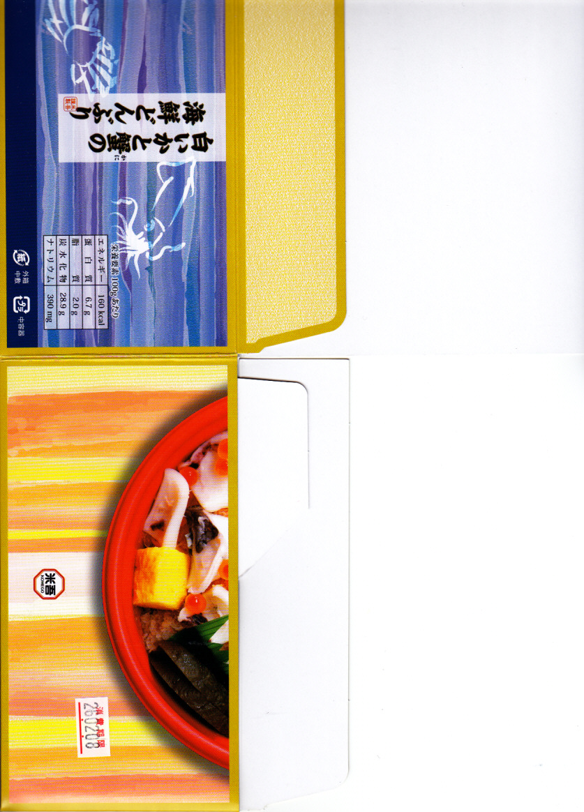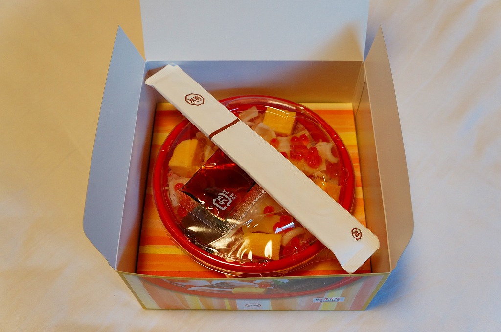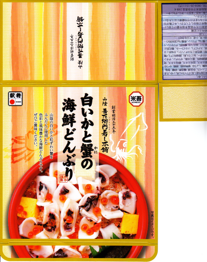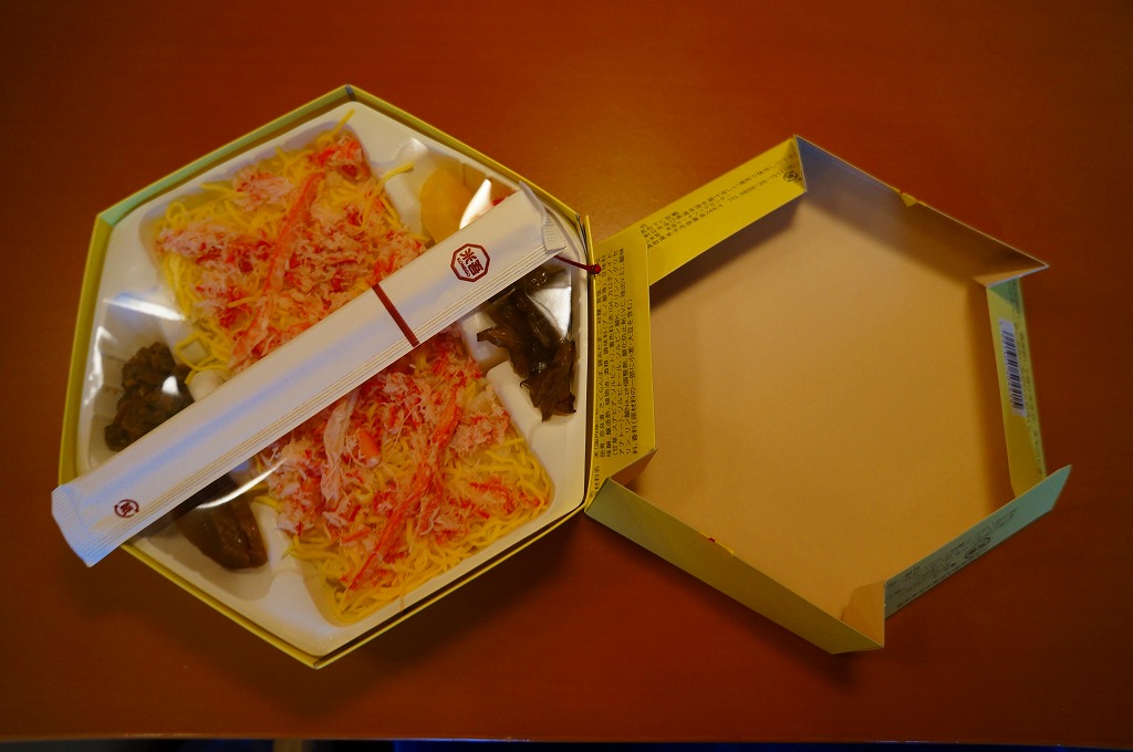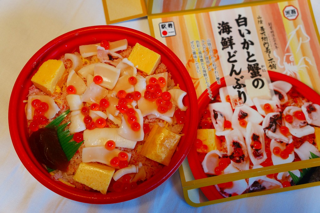 2013〜2014年の駅弁大会シーズンのみの販売か。現地で売られたかは定かでない。丼に酢飯を詰め、錦糸卵、カベニズワイガニのほぐし身、玉子焼、白いか、イクラを散らし、奈良漬けを添える。柔らかいイカの香りを楽しめた。
