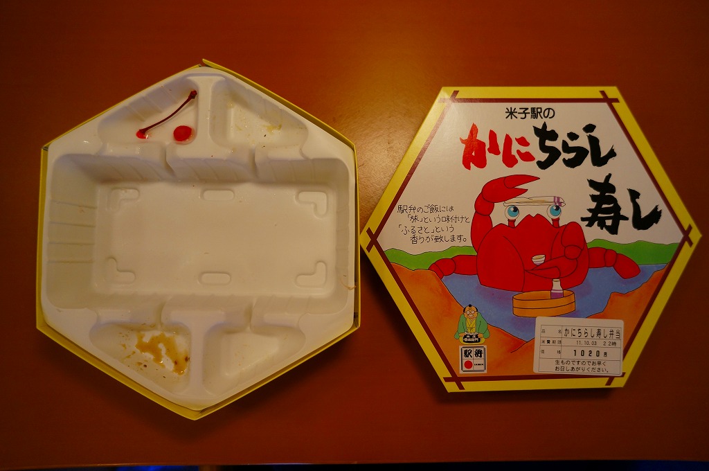 上記の駅弁「山陰吾左衛門寿し本舗蟹寿し」の、2001(平成13)年時点での姿か。長方形のボール紙製のパッケージにホカホカ弁当風な簡素な容器が入る。中身は酢飯の上に錦糸卵とカニの身が載るだけのシンプルな構成。昭和中期には登場しているはずが、なぜか時刻表や調製元のウェブサイトなどの資料に登場しない、幻?の駅弁。ただし味はよい。