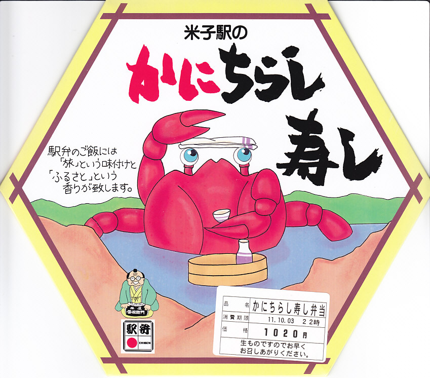 クリーム色で正六角形のボール紙製容器には、カニが中海に漬かっているようなマンガが描かれる。白いプラ製トレーに収まる中身は、酢飯を錦糸卵で覆いベニズワイガニのほぐし身と細いカニ脚肉を載せ、パイナップル、しじみ、ワカメ佃煮、奈良漬、さくらんぼを添えるもの。つまり古き佳き時代からの山陰地方特有のカニ寿司駅弁。パインとさくらんぼを詰める点にも古めかしさが出ている。価格は2011年の購入時で1,020円、2014年4月の消費税率改定で1,050円。2017年までの販売か。