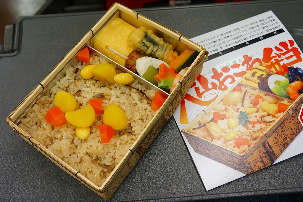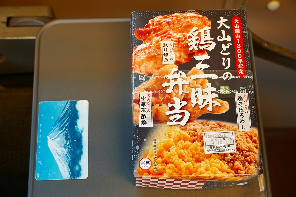 大山おこわは、鳥取県西部の大山山麓、伯耆国の汗入(あせり)エリアの郷土料理。祭事の料理としてのおこわそのものを指すようで、おこわであることと、できれば醤油味であること以外に、定義のようなものはないらしい。この駅弁も含め、商品やレシピで見る大山おこわはだいたい、醤油味の五目おこわ。大山の向こう側の岡山県真庭市や美作国の蒜山(ひるぜん)には、もち米に鶏肉や油揚げその他をふんだんに混ぜて蒸すという、結果的に大山おこわと同様の内容となる郷土料理、蒜山おこわがある。