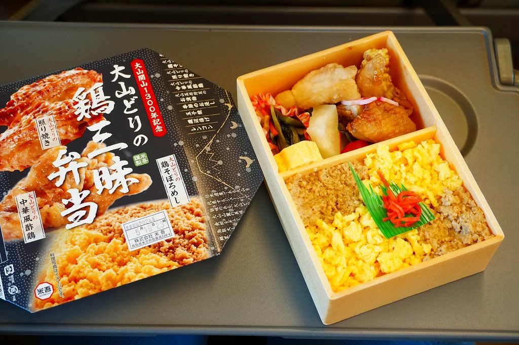 中身は半分が鶏飯で、白飯を大山どりの鶏そぼろと玉子そぼろで覆い、紅生姜で彩るもの。半分がおかずで、大山どりの照り焼き、大山どりの油淋鶏(ゆーりんちー)または中華風酢鶏、大山高原野菜のお漬物、季節のお浸し、玉子焼、ちくわ磯辺揚、にんじんとだいこんの煮物、花れんこん。鳥取県米子市の鶏肉製造工場の商品「大山どり」をふんだんに使った鶏飯。価格は2017年の発売時で1,200円、2020年時点で1,250円、2023年時点で1,296円。