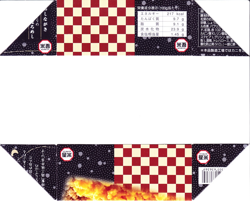 秋冬の駅弁大会シーズンに向けた、2008(平成20)年秋の新作で、吾左衛門酢(吾左衛門寿し)の実演販売での併売商品として誕生したと思われる。プラ製の井形の容器に、表面に商品名を、裏面に由来文を書いたボール紙でふたをする。中身は茶飯の上に赤貝(サルボウ貝)を30個程度ばらまき、昆布巻や玉子焼、カマボコ揚や煮物などを添えるもの。