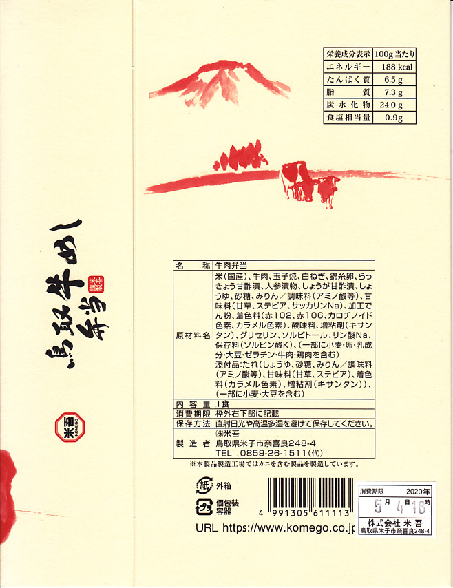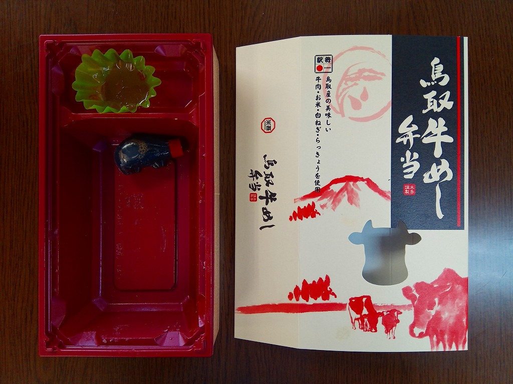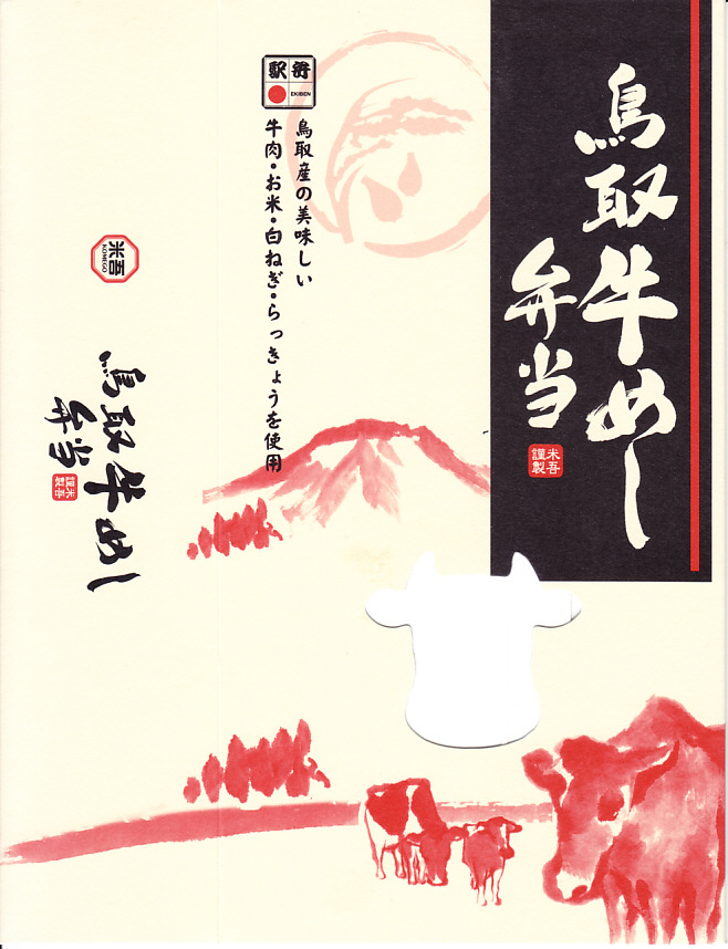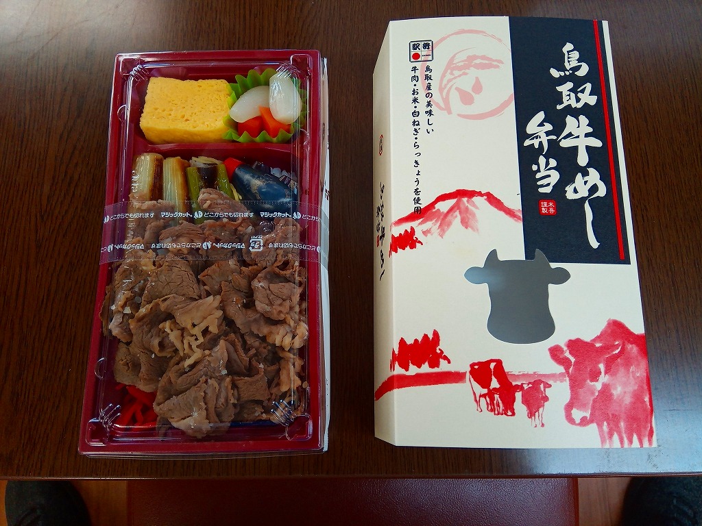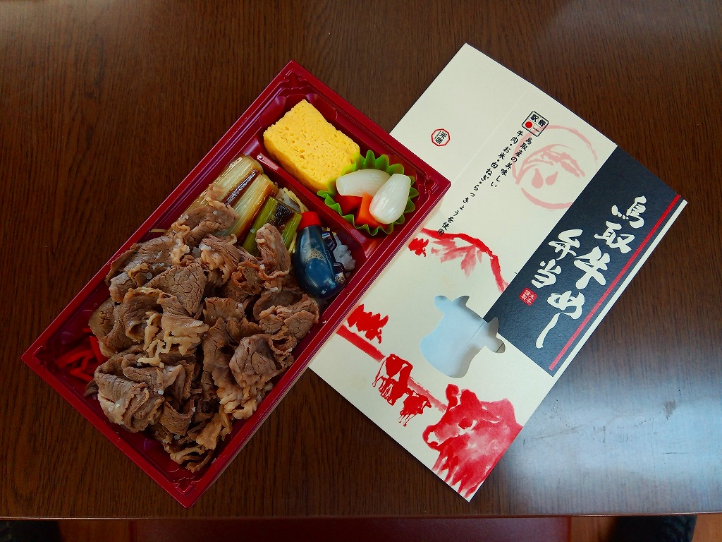 2014(平成26)年の発売か。白飯を牛肉で覆い、白ネギ焼と紅生姜とタレを付け、玉子焼とラッキョウ漬を添える、全国各地でよくあるタイプの牛肉駅弁。米子駅の駅弁は「吾左衛門鮓」シリーズその他、棒寿司や酢飯の駅弁だらけなので、こういう普通のものがあると不思議な感じ。固めの味は、ふわふわしていた。価格は2016年時点で1,080円、2020年時点で1,100円、2023年時点で1,458円。