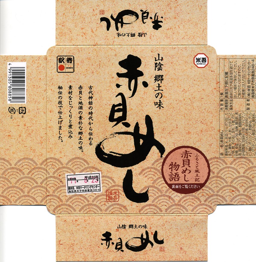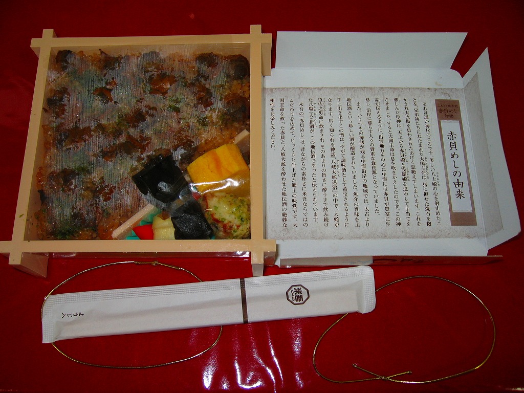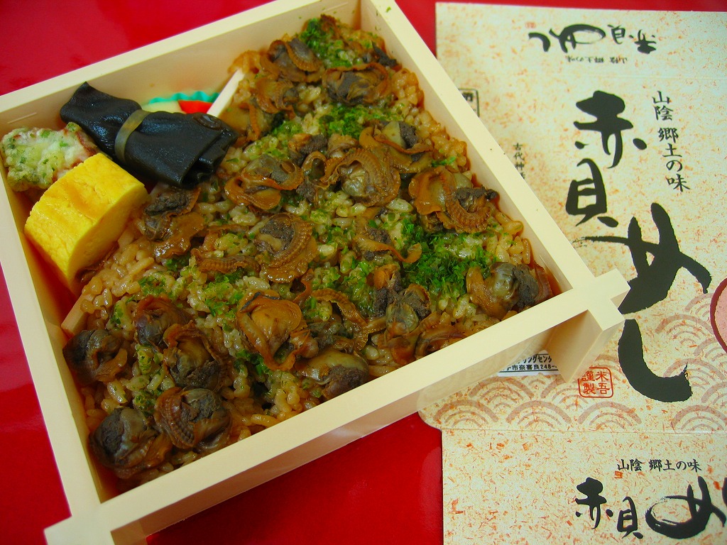 催事場ブースでの主役は吾左衛門鮓で揺るぎないだろうが、こちらも味で負けないなかなかの駅弁。現地で販売されているかは分からないが、赤貝飯は出雲の郷土料理であるため、駅弁になくても食堂や弁当で食べることはできるだろう。価格は2008年の購入時で900円、2014年4月の消費税率改定で930円。2017年までの販売か。
