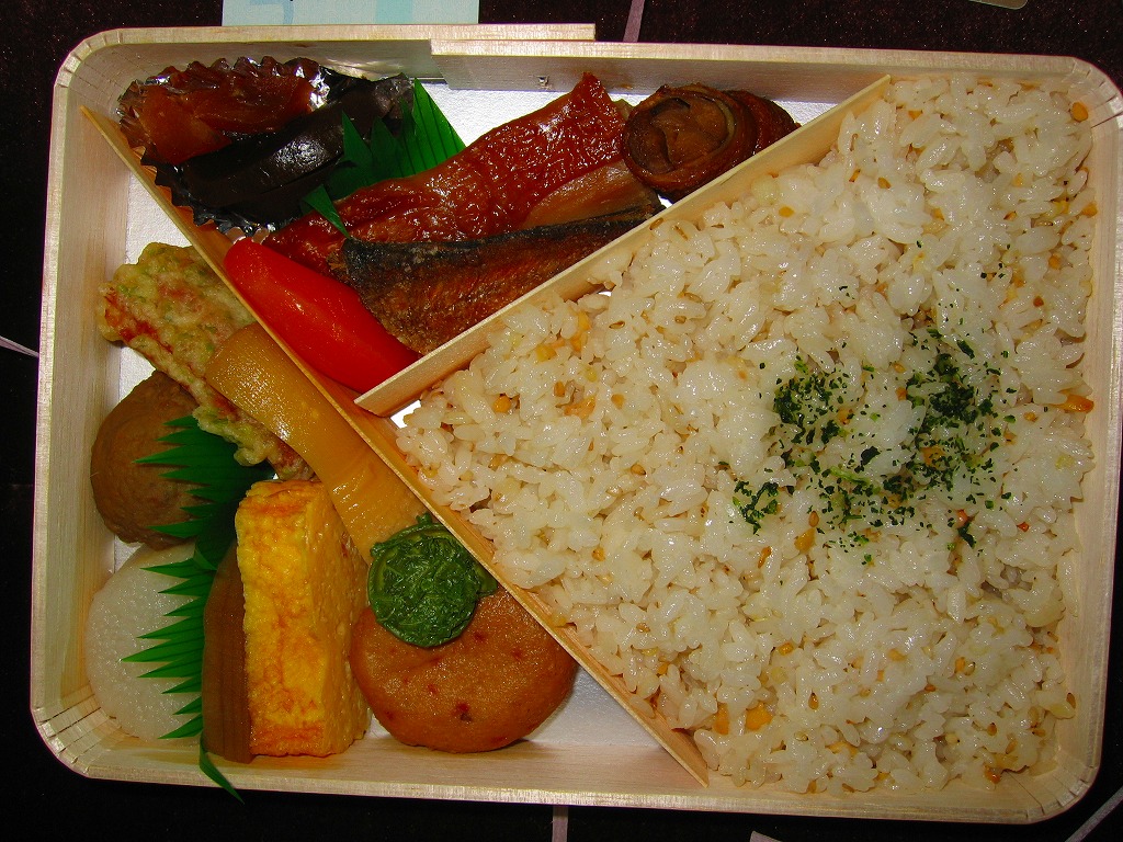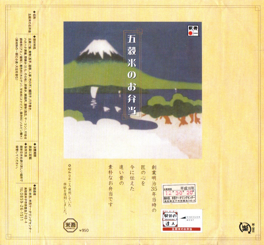 JR西日本の駅弁キャンペーン「駅弁の達人」の実施に伴い、2004(平成16)年5月1日に発売。経木枠の長方形の容器に木目調のふたをして、昭和9年頃のデザインを取り込んだ掛紙をかけて、紙ひもでしばるのは正統派の駅弁スタイル。中身は2枚の経木で斜めに仕切り、大豆・押麦・いりごま・玄米・キヌアの五穀米を五角形に詰め、鶏照焼や穴子巻やハタハタ唐揚げを加え、イワシ団子や玉子焼などを添える。食材は主に地元産品を使用したそうで、内容でも薄味な風味でも健康志向が感じられる駅弁。2004年度のJR西日本の駅弁キャンペーン「駅弁の達人」の対象駅弁。現在は売られていない模様。