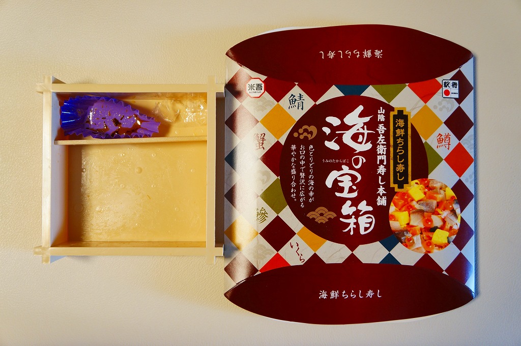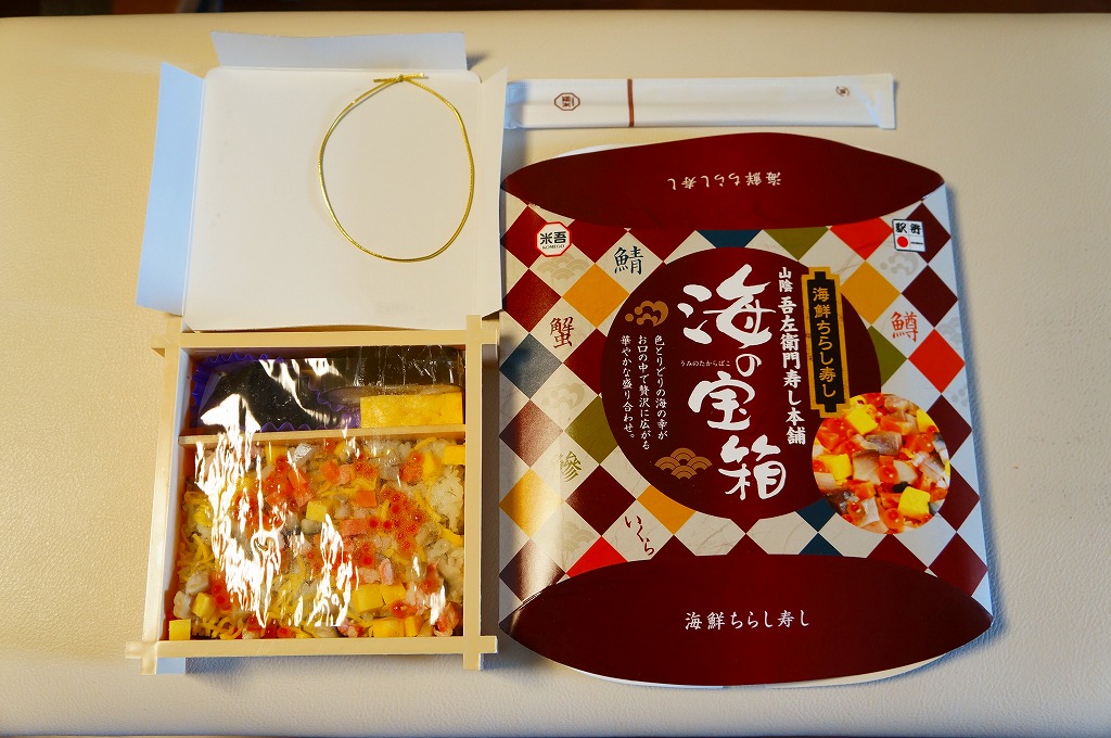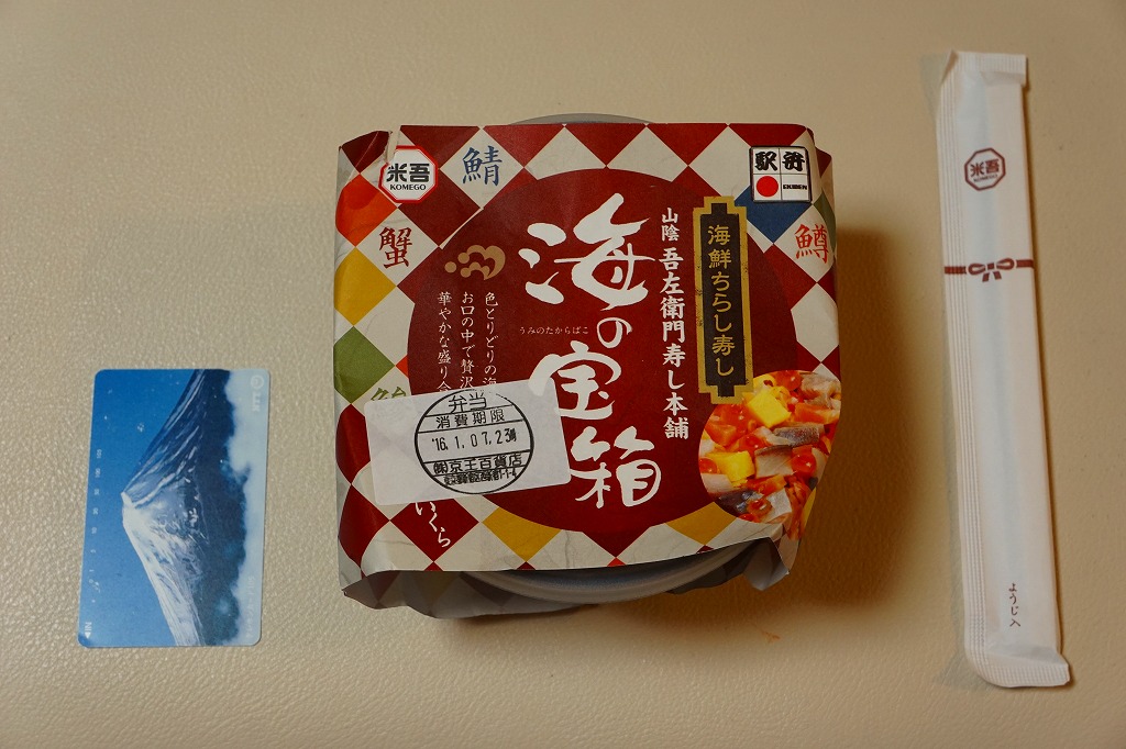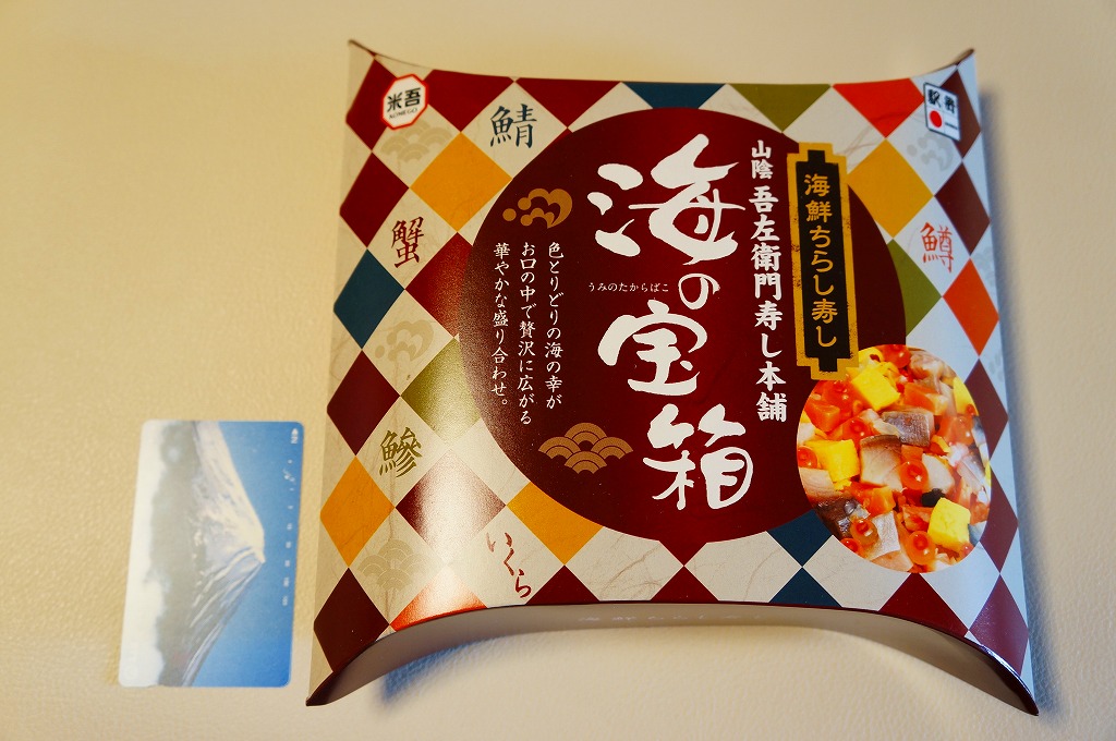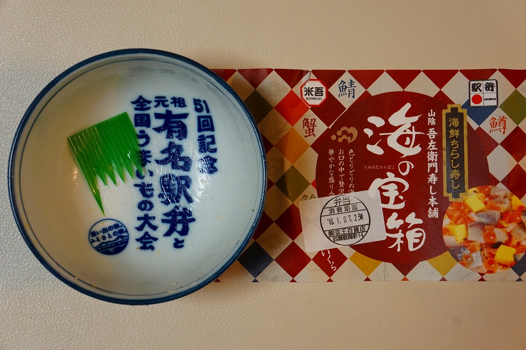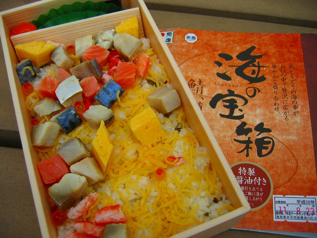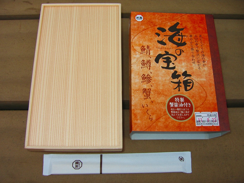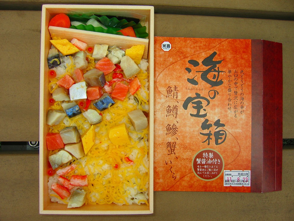 米子駅の駅弁「海の宝箱」について、2016(平成28)年1月の京王百貨店の駅弁大会で、容器に「51回記念元祖有名駅弁と全国うまいもの大会」どんぶりを使い、一日あたり300個を1,500円で実演販売したもの。前年に名古屋駅「抹茶ひつまぶし日本一弁当」で同じことをした際には、連日即売切の大人気であったのに、これは不人気。中身は通常版と同じはずが、暖かく乾燥した催事場で長く留め置かれたためかどうか、酢飯は酸味が強く、具はパサパサで、いつもの味が出ていなかった。