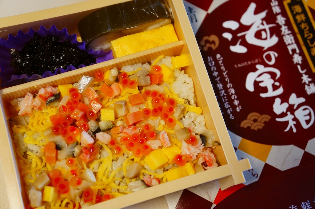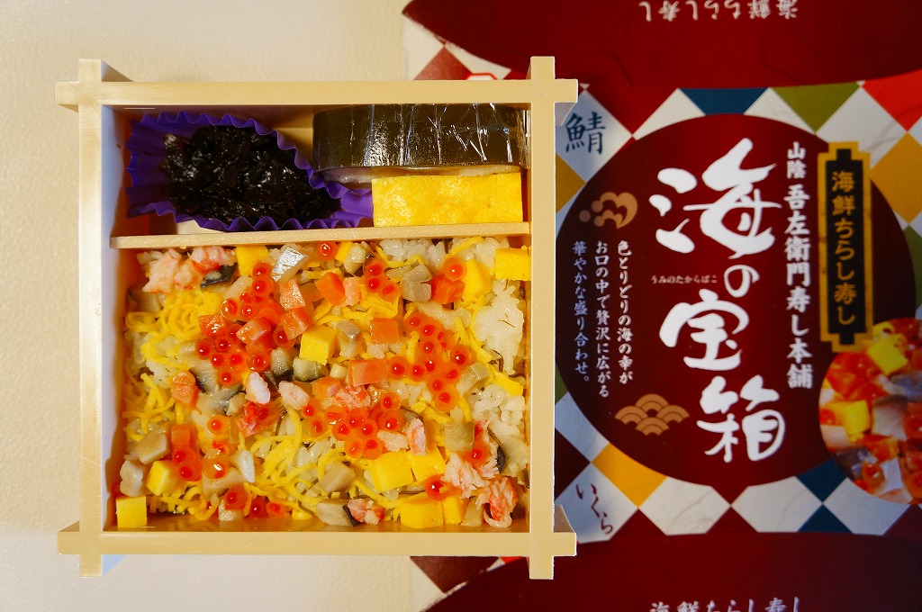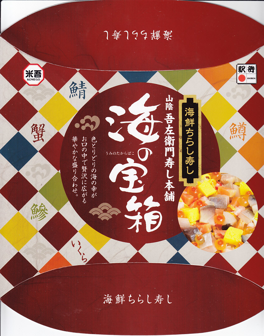 秋冬の駅弁大会シーズンに向けた、2008(平成20)年秋の新商品か。酢飯を錦糸卵で覆い、サバとマスとカニとアジと玉子焼をサイコロ状に刻んで散らし、イクラも散らし、吾左衛門鮓鯖1切れと玉子焼と海藻佃煮を添える。写真よりも実物で、御飯の部分がキラキラと光り、みずみずしい味を持つ。箸でいただくには、つまみ上げにくくはある。価格は2013年のリニューアル当時で980円、2014年の消費税率改定により1,000円、2020年時点で1,200円。2022年時点で名前を「海の宝石箱」に変え、同年内に終売か。