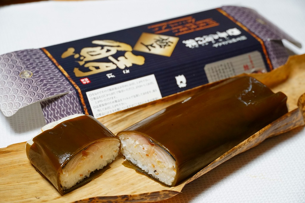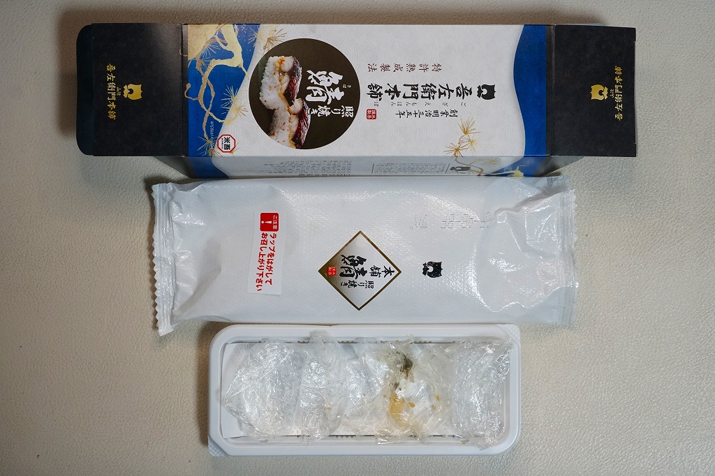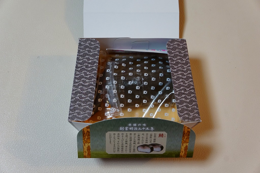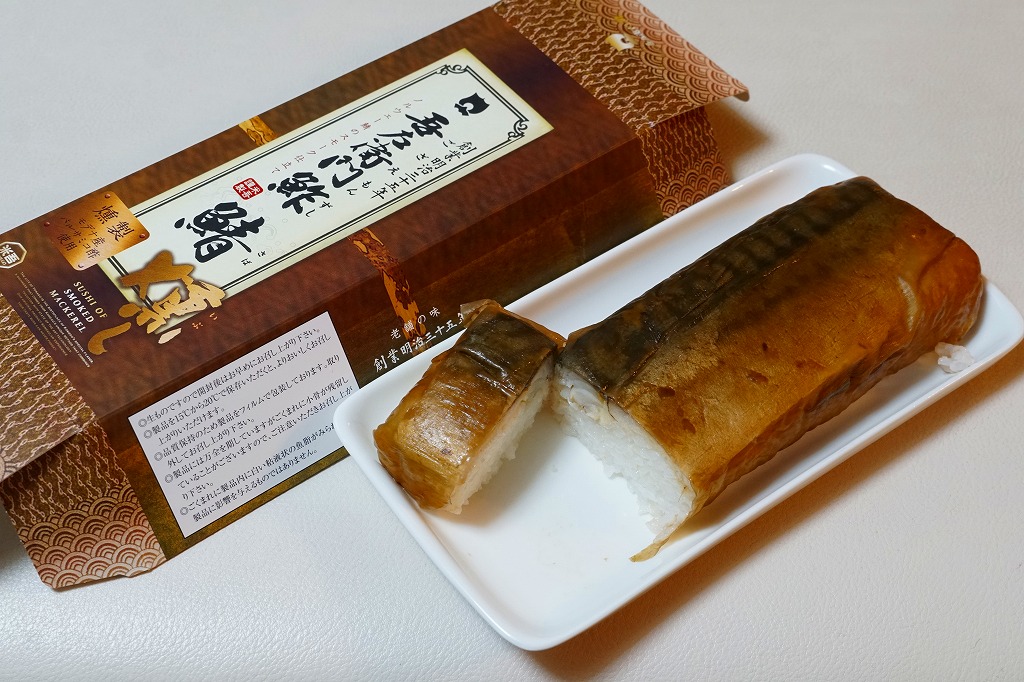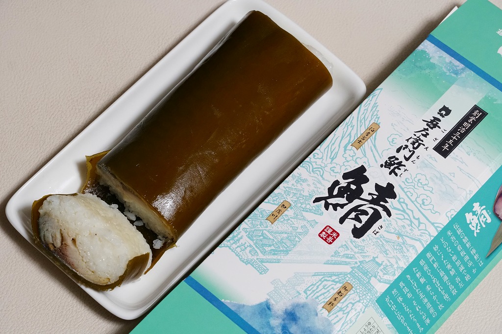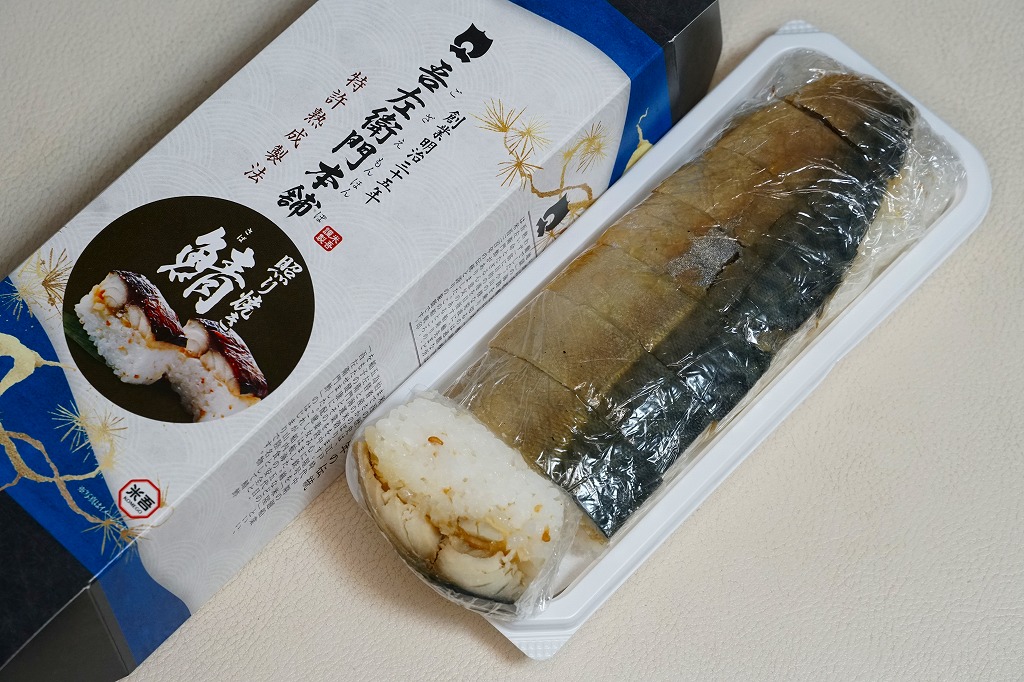 身は「吾左衛門鮓」のものを思うとだいぶ薄めで、サバは紙箱の見本写真ほど焼かれておらず、サバ寿司向け焼きサバと焼かないサバの中間くらいに感じたのは気のせいか。価格は2021年時点で1,450円、2023年時点で1,500円、2025年時点で1,700円。