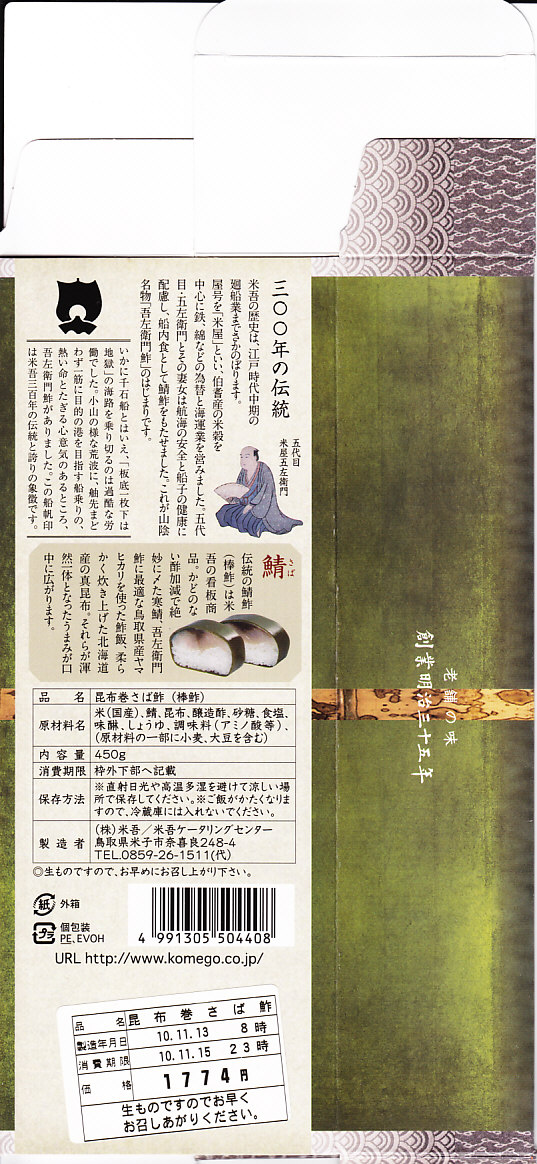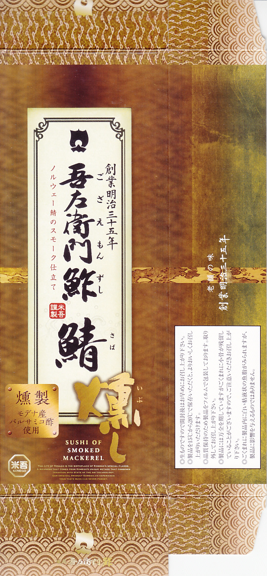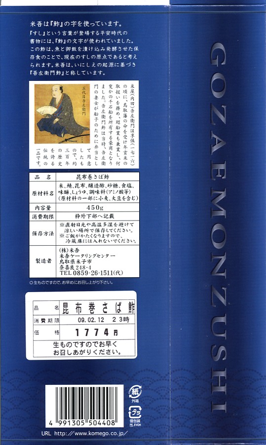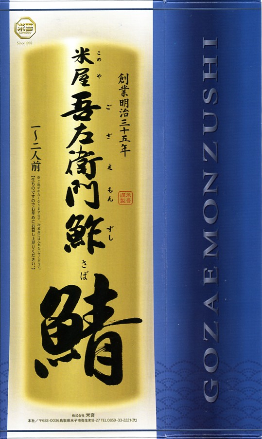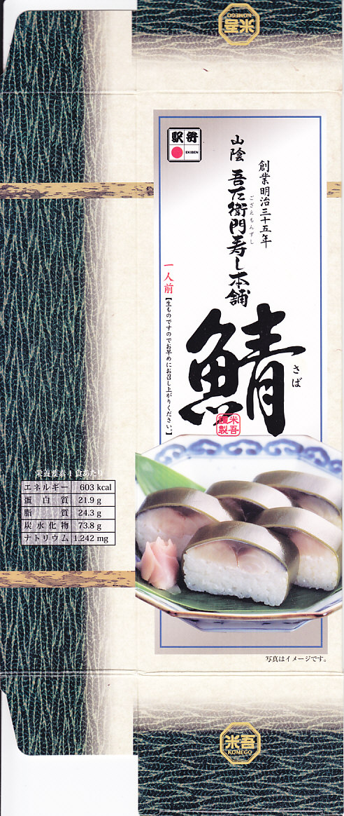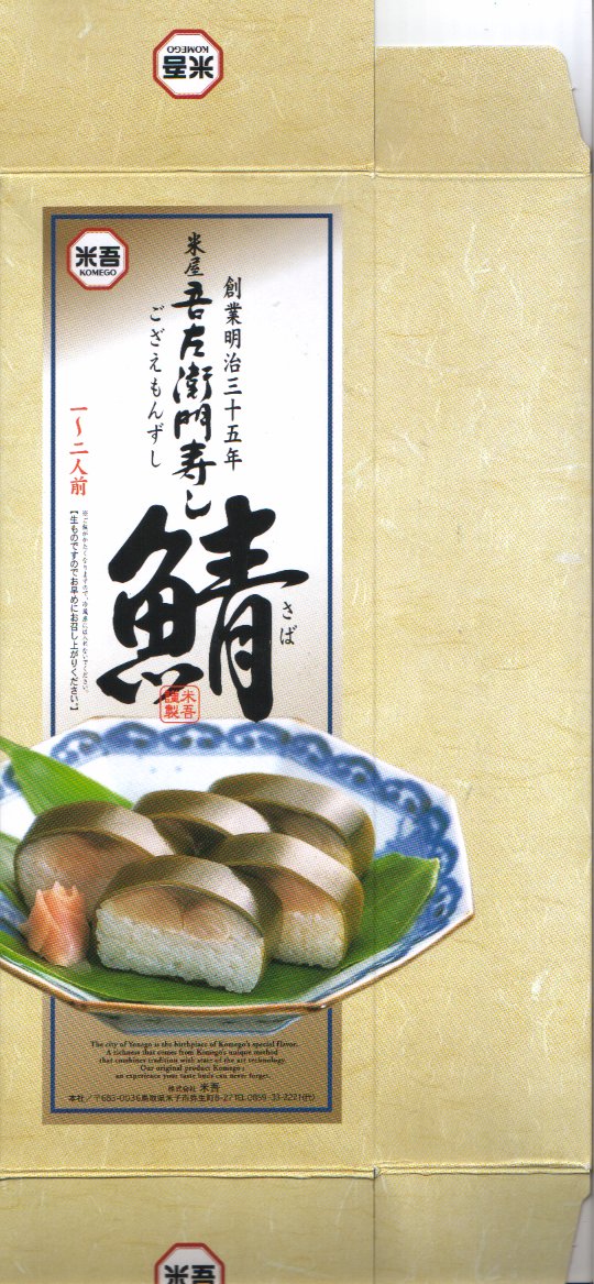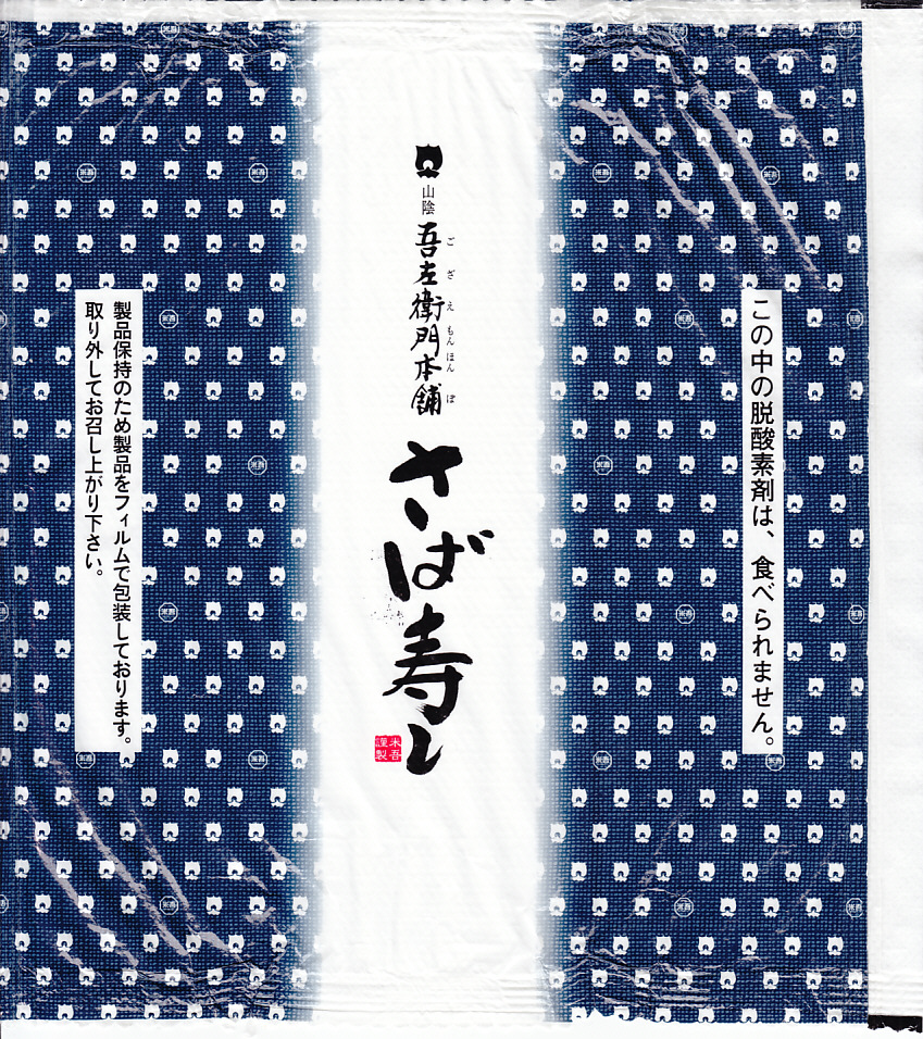 2004(平成16)年12月30日の調製である、米子駅弁のパッケージ。2008年8月までは現在の「吾左衛門鮓」ではなく「吾左衛門寿し」と表記されていた。読み方は同じ「ござえもんずし」。この頃は鳥取米ヤマヒカリの酢飯と境港のサバを合わせて、北海道日高産の昆布で巻いた商品だった。2004年度のJR西日本の駅弁キャンペーン「駅弁の達人」の対象駅弁。