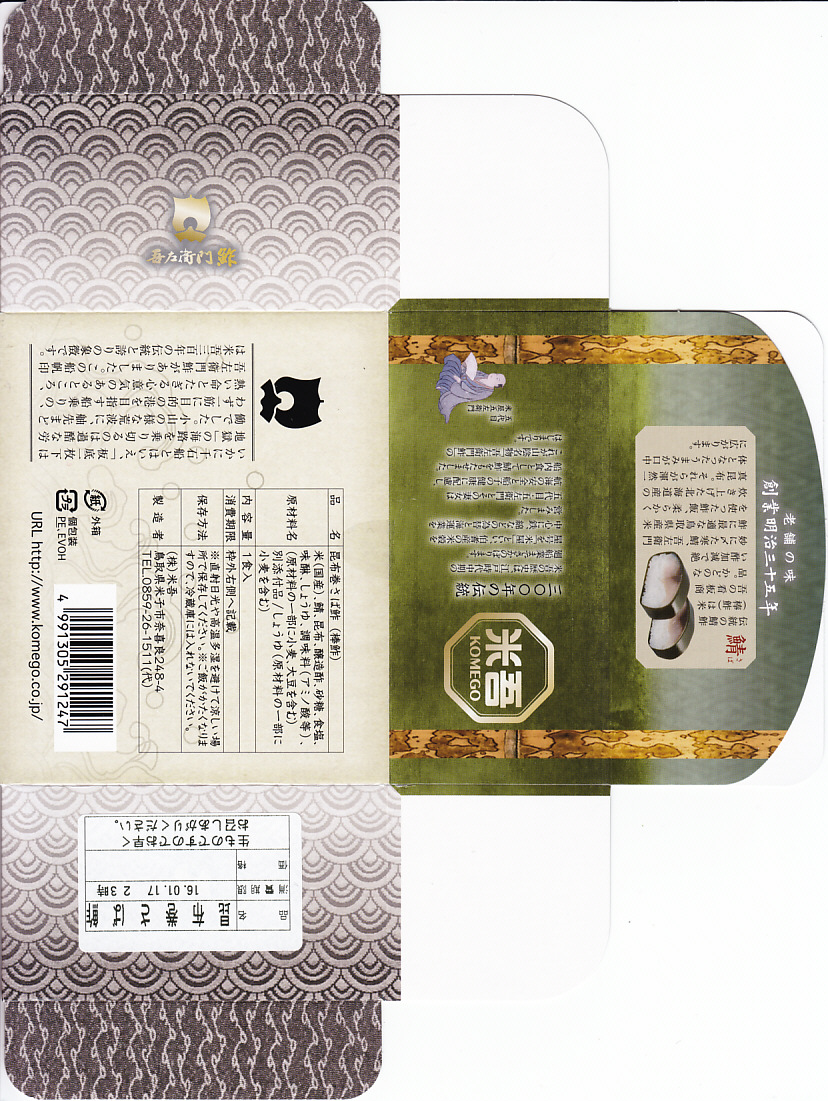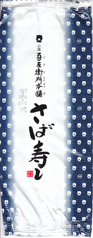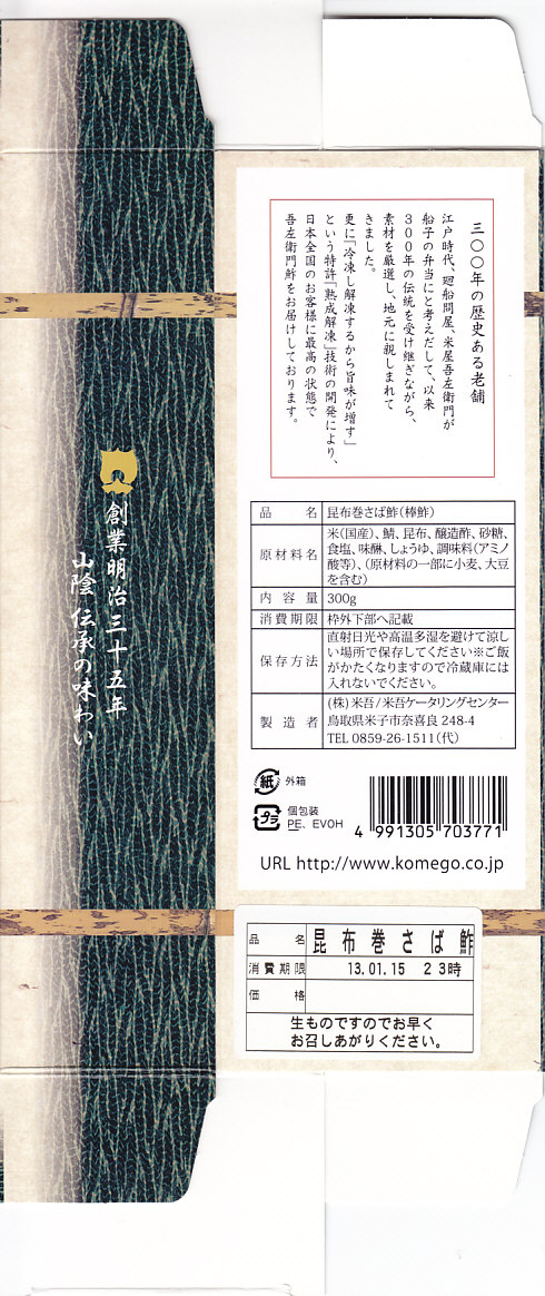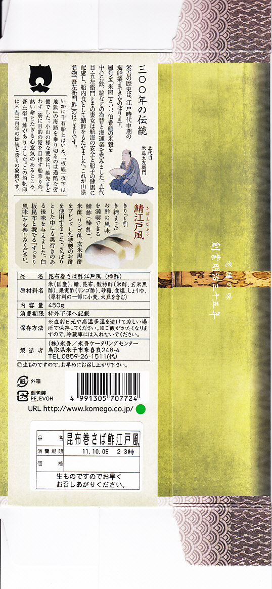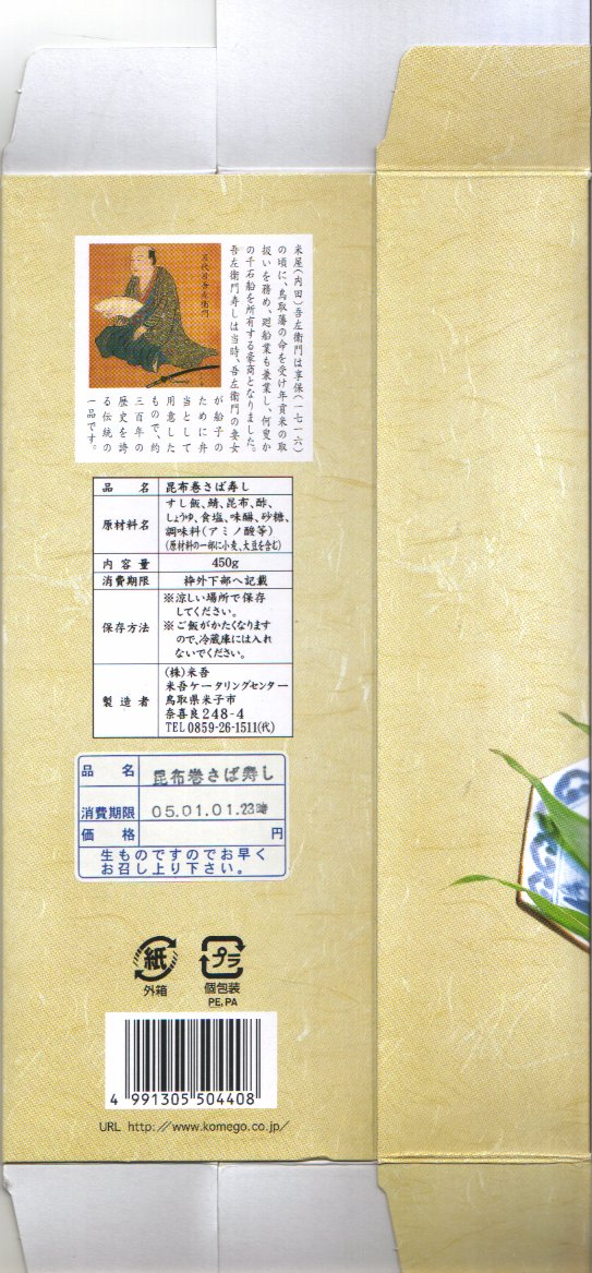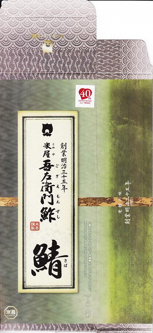2004(平成16)年12月30日の調製である、米子駅弁のパッケージ。2008年8月までは現在の「吾左衛門鮓」ではなく「吾左衛門寿し」と表記されていた。読み方は同じ「ござえもんずし」。この頃は鳥取米ヤマヒカリの酢飯と境港のサバを合わせて、北海道日高産の昆布で巻いた商品だった。2004年度のJR西日本の駅弁キャンペーン「駅弁の達人」の対象駅弁。