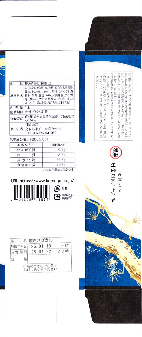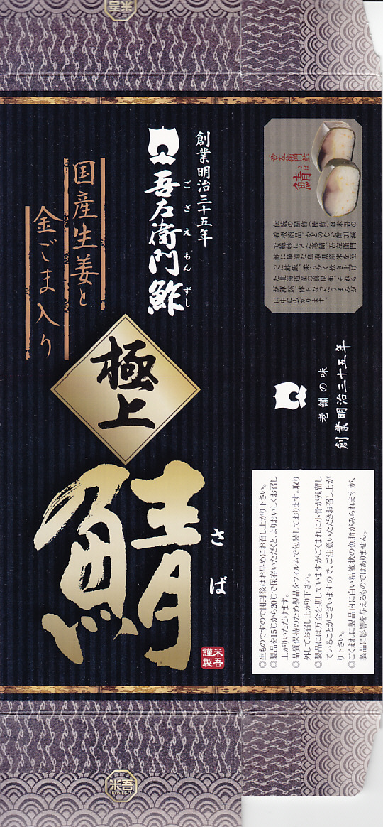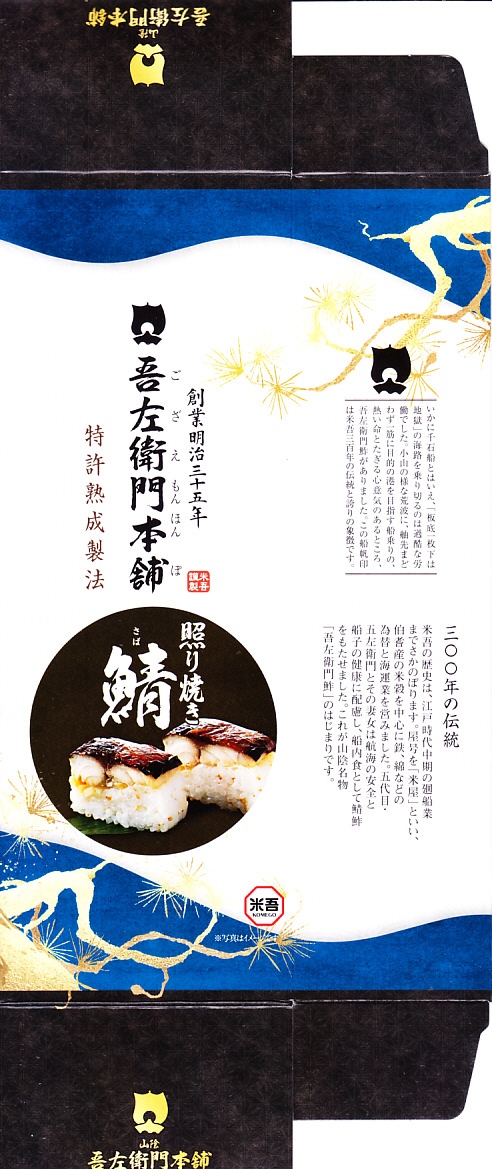 下記の過去のものによらず、2021(令和3)年に米子駅や催事などで発売か。その名のとおり、米子駅弁の吾左衛門鮓シリーズの、1人前バージョン「吾左衛門本舗」の、照り焼き鯖のもの。体裁は他のものと同じく、棒寿司をラップで巻いてトレーに収め、袋詰めしてから紙箱に収めるもの。これは白ごまを混ぜた酢飯に、甘酢生姜を挟んで焼き鯖を貼り、包んだラップごと8切れにカットしていた。