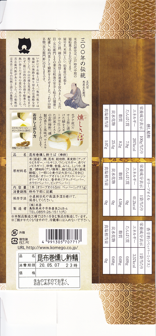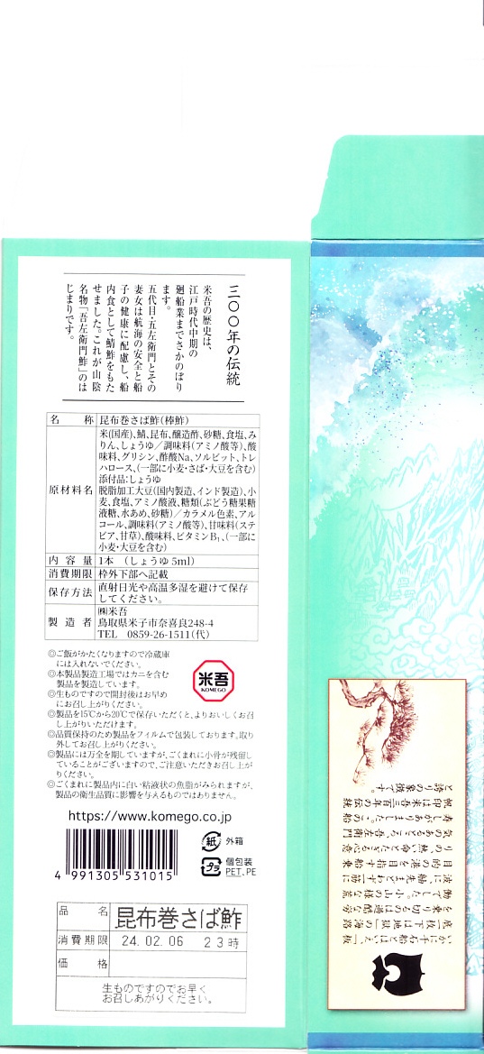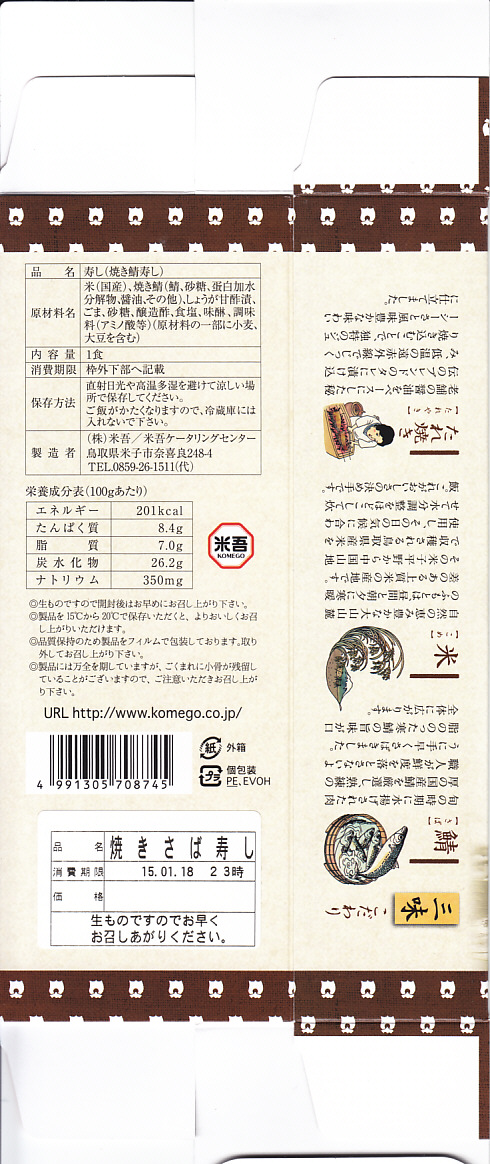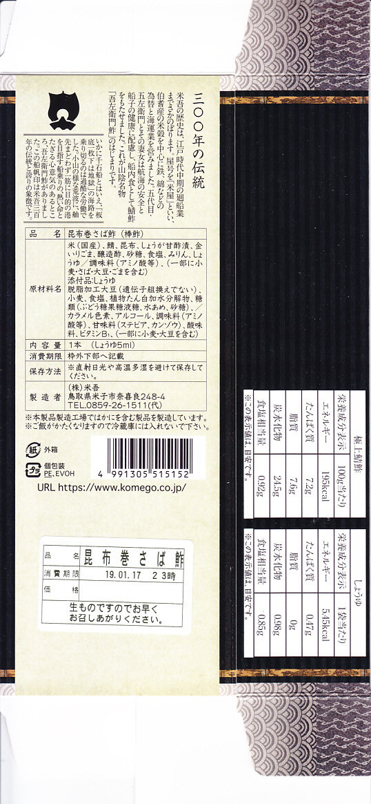 昆布が白板になっている以外、容器も内容も価格も通常版と変わらないと思うが、パッケージを読むと酢も違うらしい。今回の味は酢締め鯖と焼鯖の中間にあるミディアムレアな焼き魚という感じ。江戸を名乗るも、東京で売られるものとも異なる。価格は2011年の購入時で1,890円、2015年時点で1,900円。2015年頃までの販売か。