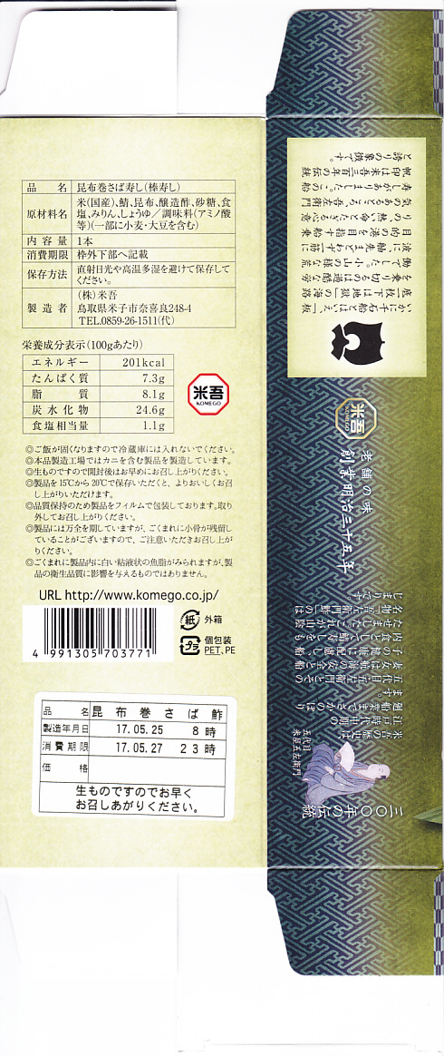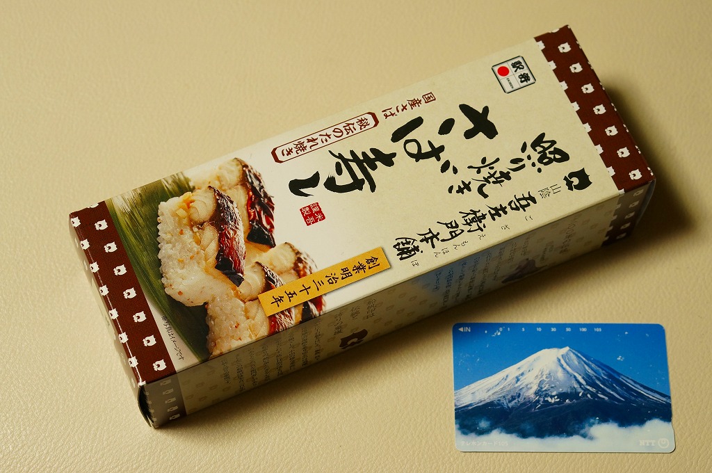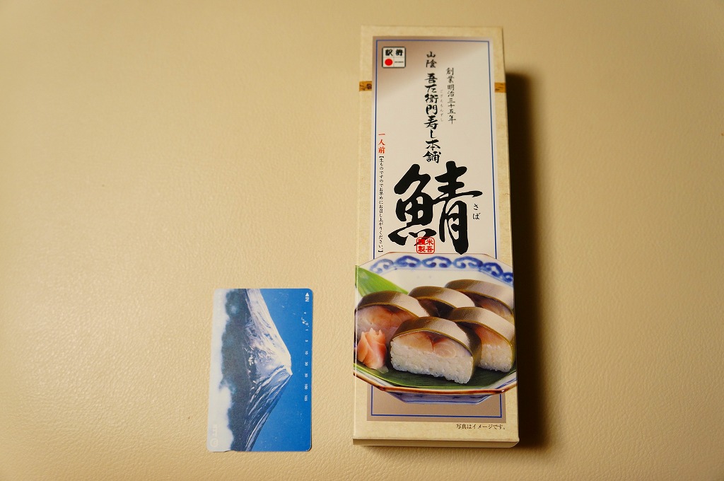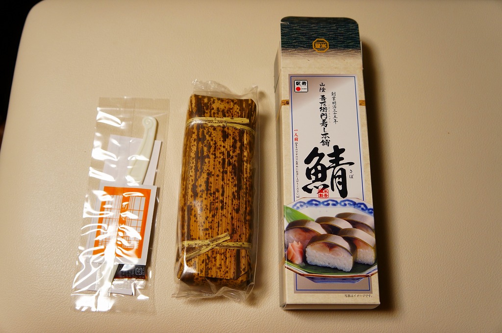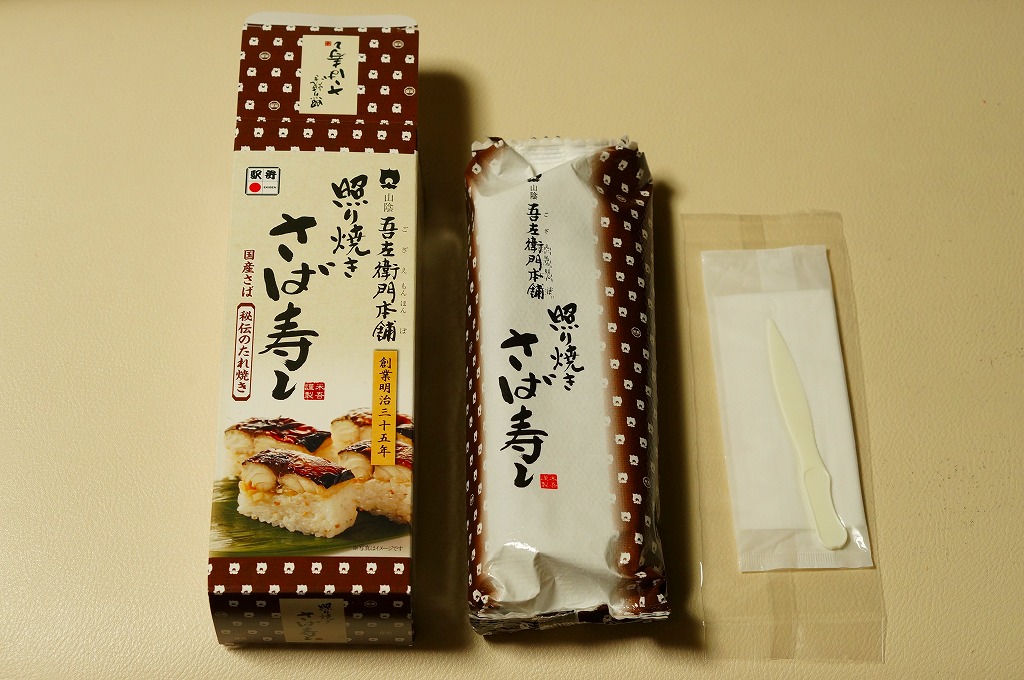 1978(昭和53)年に発売。米子駅で名物の駅弁であり、主力の商品。鳥取県産米を使う酢飯に身の厚いサバを合わせ、北海道産の黒板昆布で巻いた棒寿司を、製造直後に急速冷凍し出荷する直前にゆっくり解凍し、専用の袋に密封し、紙箱に詰める。食べるときは付属のプラ製ナイフで切り分ける。分量も価格も味の良さもひとりぶんではなく、お土産として持ち帰り自宅で食べるのが便利だろう。