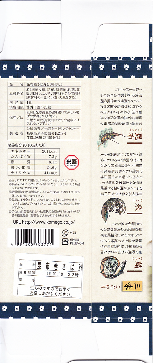 2015(平成27)年1月17日に購入した、米子駅弁のパッケージ。箱の中身と包装が同じなので、2年後の上記の駅弁「吾左衛門本舗 鯖」と同じものだと思う。紙箱の絵柄と、そこに書かれる駅弁の名前が、微妙に異なる。