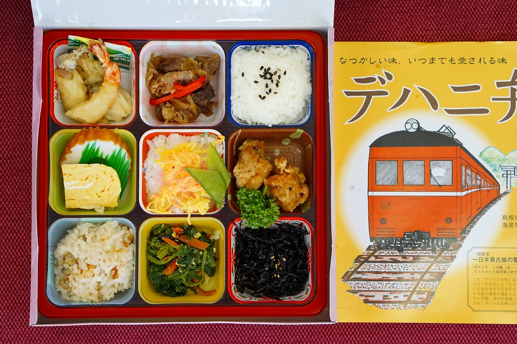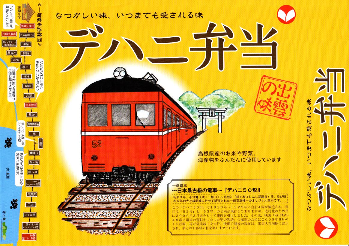 2014(平成26)年4月29日に発売された、土休日限定の駅弁。一畑電車の松江しんじ湖温泉駅と出雲大社駅で、同じものが売られる。名前のとおり、1928(昭和3)年生まれで映画に出演した一畑電車最古の現役車両「デハニ50」であり、掛紙にはそのイラストが描かれる。