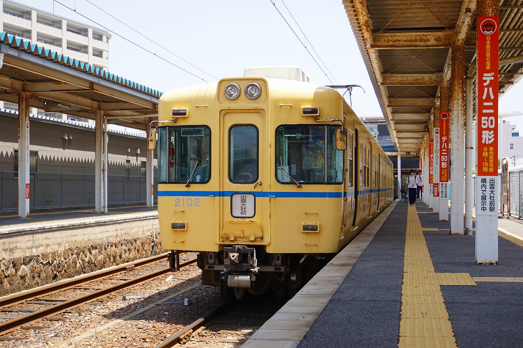 松江の城下町の南側で宍道湖に面する、一畑電車の終着駅。山陰地方で唯一の私鉄線が、松江と平田と出雲市と出雲大社を結ぶ。2014(平成26)年4月に駅弁を発売したほか、台湾の駅弁大会に毎年出展するが、駅で買える弁当はない模様。1928(昭和3)年4月5日開業、島根県松江市中原町。