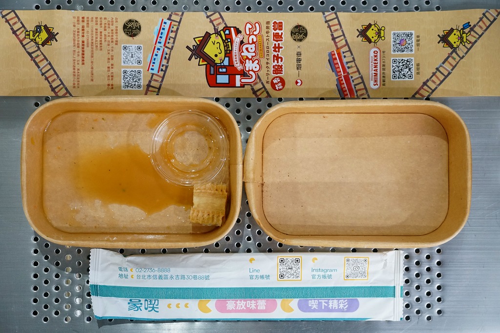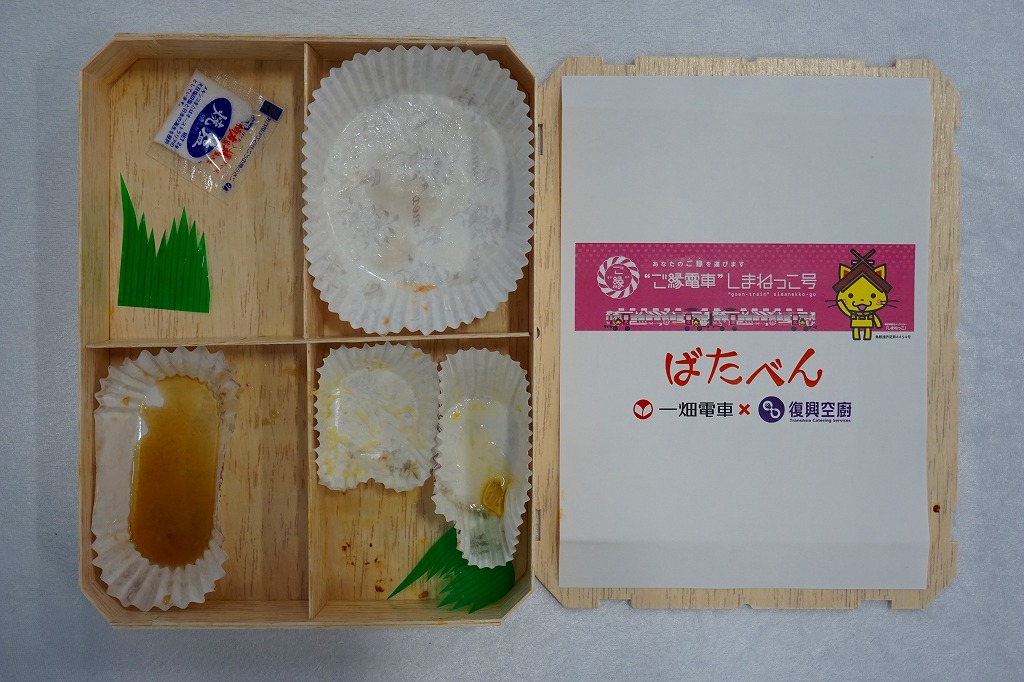 一畑電車の駅弁の掛紙には、島根県のゆるキャラ「しまねっこ」、一畑電車のイラストと社名、今回の弁当の調製元である復興空廚の社名を印刷した。四角く平たく駅弁らしい形をした木製エコ容器を4つに仕切り、それぞれにイクラを載せたチャーハン、エビやカボチャなどの天ぷら、魚の南蛮漬と牛肉煮、鶏肉とポテトとフルーツを詰めた。いずれも味は日本風、食感はべちゃっと台湾風。この「駅弁」は、出雲の地で売られることはあるのだろうか。