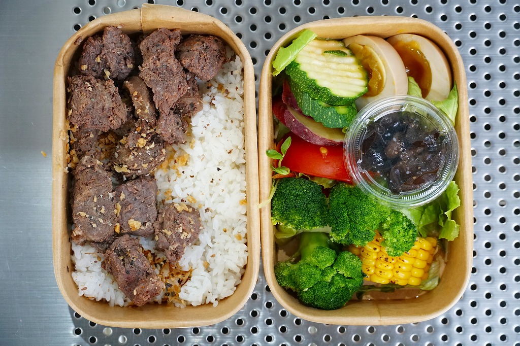 台湾の駅弁大会「鐵路便當節」の、2025年6月の台北駅での第10回開催で、一畑電車の駅弁として販売されていたお弁当。この大会に毎年出店する一畑電車では今回、この弁当のみを販売し、観光チラシを配っていた。厚紙製の弁当箱をふたつ重ね、オレンジ色の電車と島根県の観光キャラクター「しまねっこ」を描いた、黄色い掛紙を巻く。品名は掛紙に「ガーリックサイコロロースト牛弁当」とあり、繁体字表記もだいたいそんな意味。