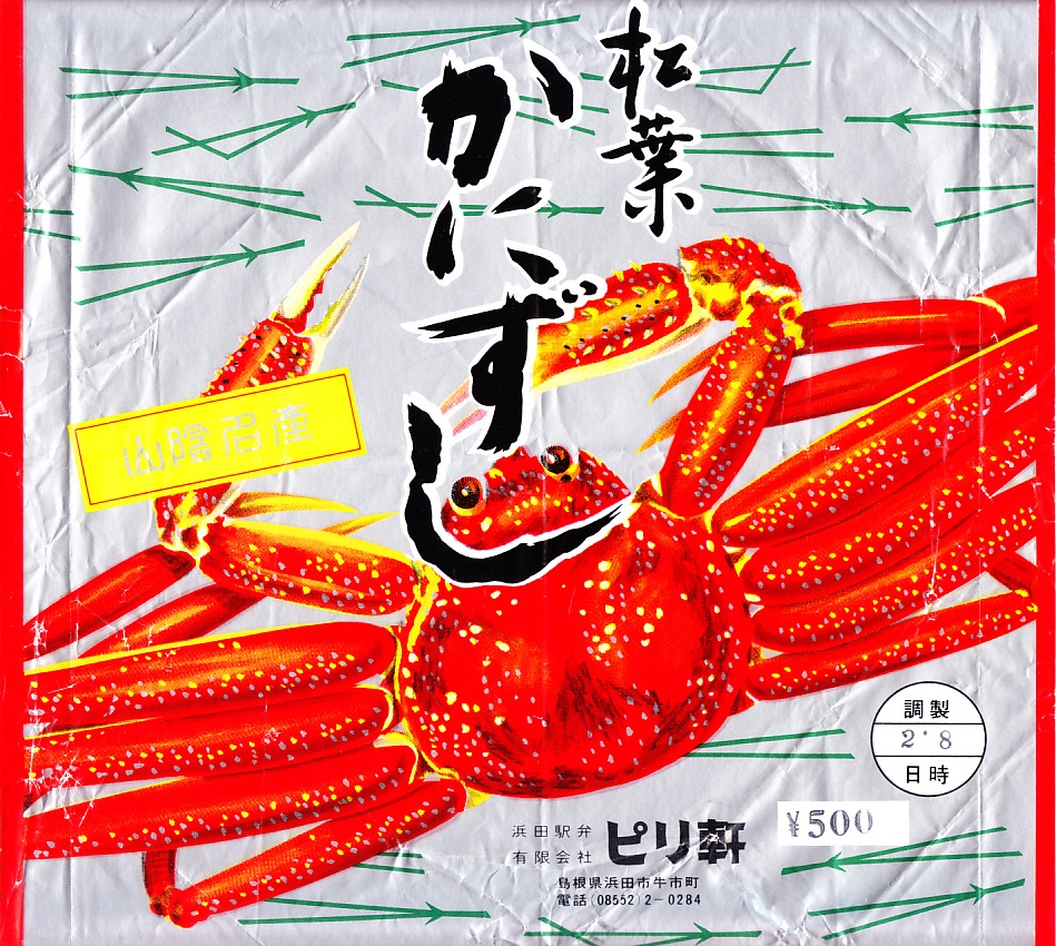 入手状況から1978(昭和53)年の調製と思われる、昔の浜田駅弁の掛紙。真っ赤に茹で上がる立派な松葉蟹を描いたのだろう。当時の山陰本線で定番のカニ寿司で、ここは調製元の変わった名前で知られた。