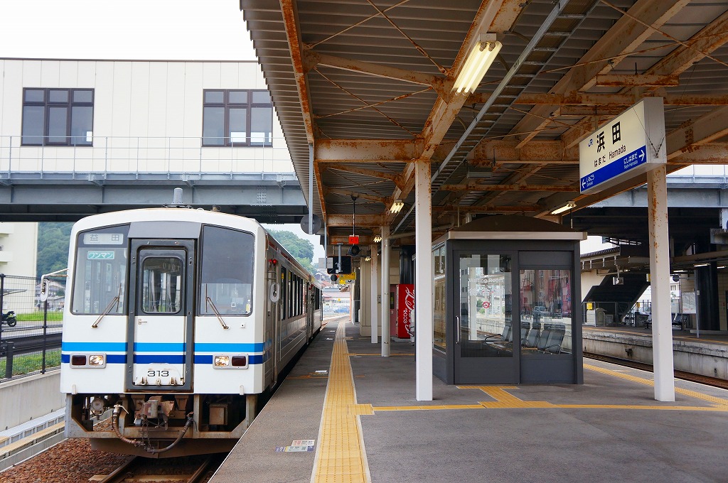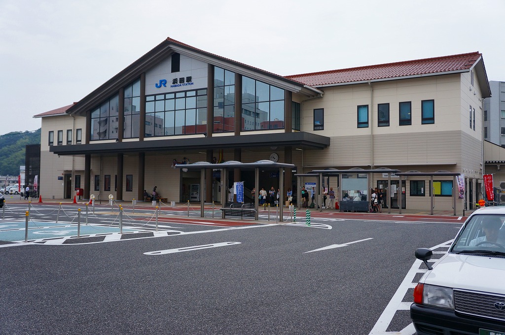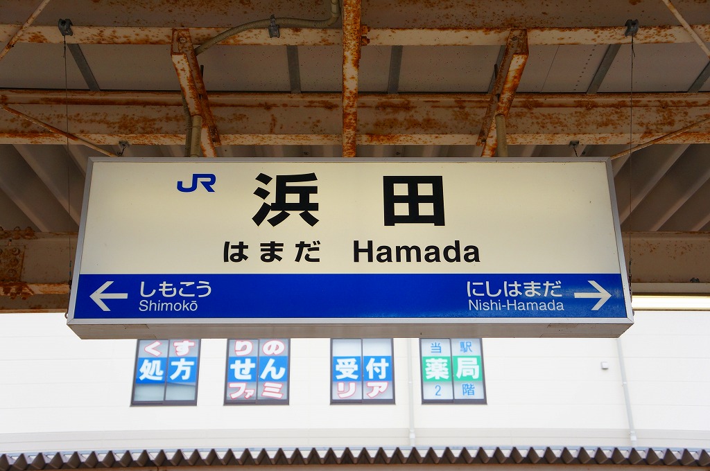 松江駅から特急列車で約100分。浜田市は島根県の南西部で日本海に面した、人口約5万人の城下町。山陰地方では有数の漁港と水産関連の工業を抱える。駅弁は駅の開業時からあり、昭和時代末期または1995年頃になくなったが、2009年築の新駅舎の1階にある、浜田市観光協会特産品販売所で売られるサバ寿司などを、駅弁とみなす人がいる。1921(大正10)年9月1日開業、島根県浜田市浅井町。