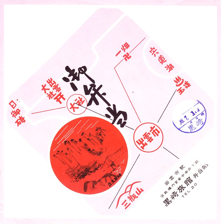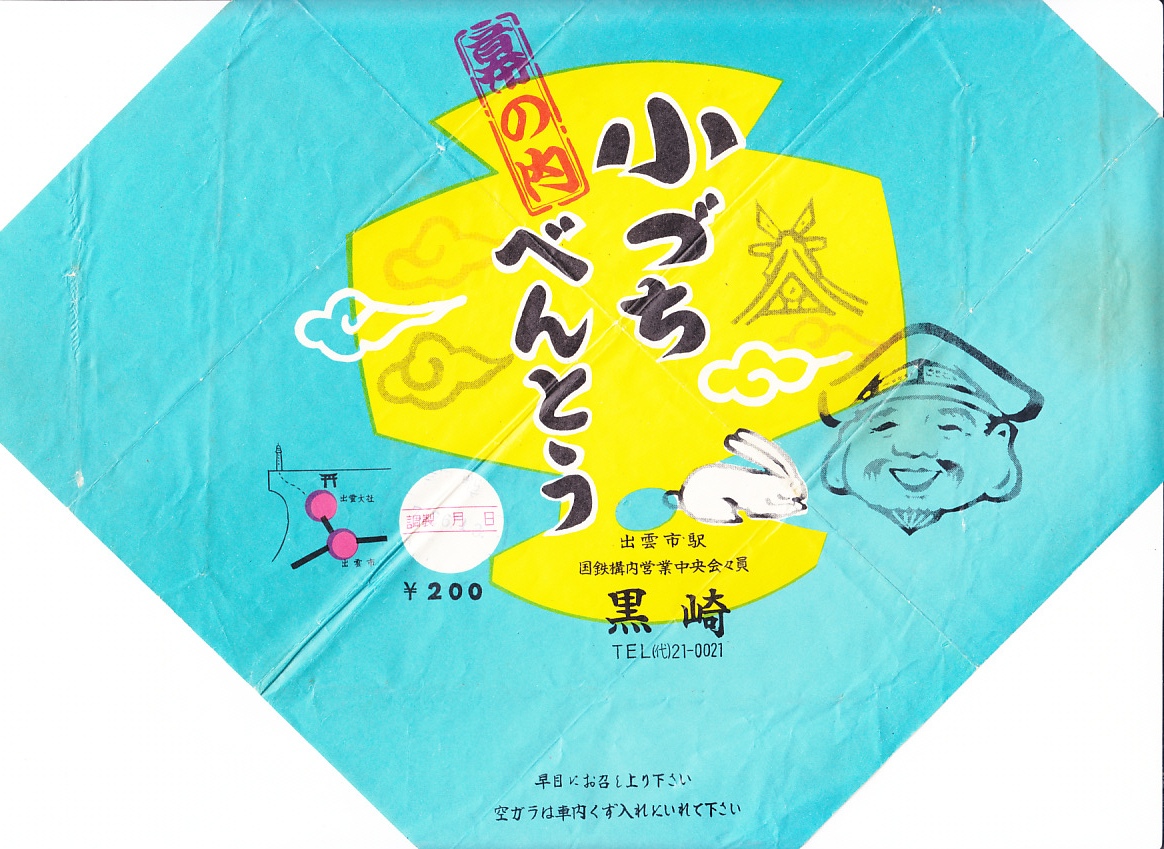 第二次大戦前の調製と思われる、昔の出雲今市駅、現在の出雲市駅の駅弁の掛紙。収集者は1938(昭和13)年6月4日の調製とみなし、掛紙にそう記した。調製印は日と時のみを示し、絵柄に名所その他の情報が何もなく、いつのものかは分からない。